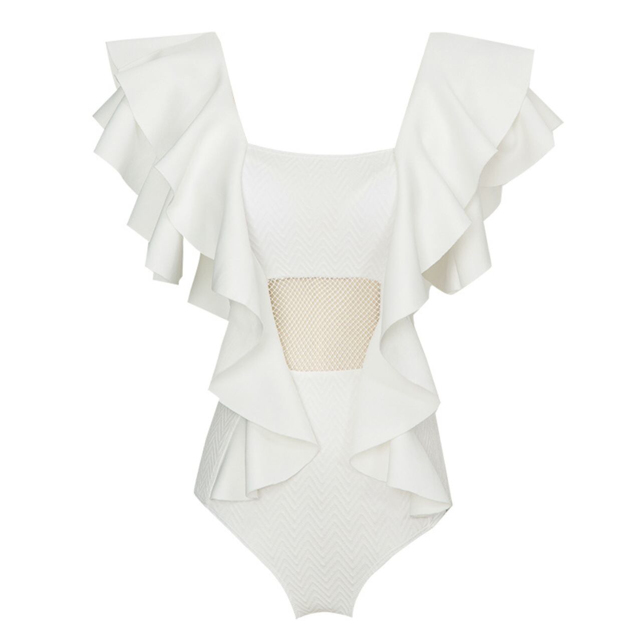 シンプルなホワイトカラーにフリルデザインが加わることで、女性らしい印象を引き立てます。ウエスト部分はホローデザインになっており、メッシュパネルは、さりげないセクシーさを演出。視覚的にウエストを細く見せる効果も期待できます。