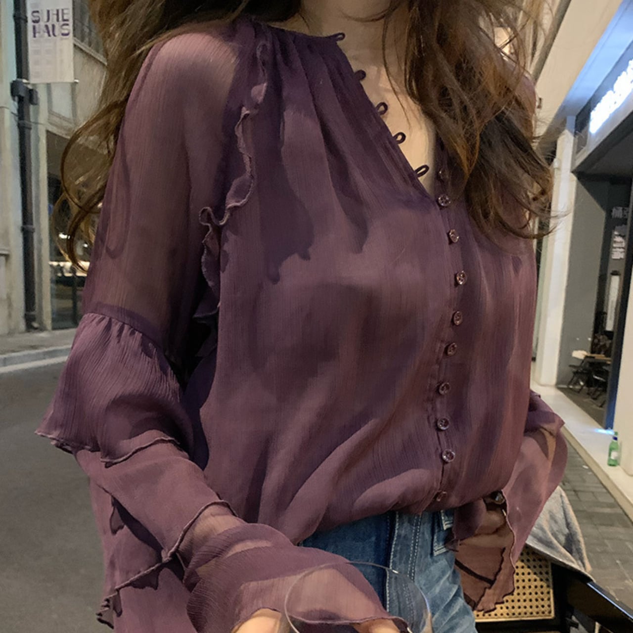 胸元まで続く小さなボタンの連なりがヴィンテージライクな魅力をプラスし、コーディネートに特別感を与えます。深いパープルカラーは、大人の品格と優雅さを同時に表現します。