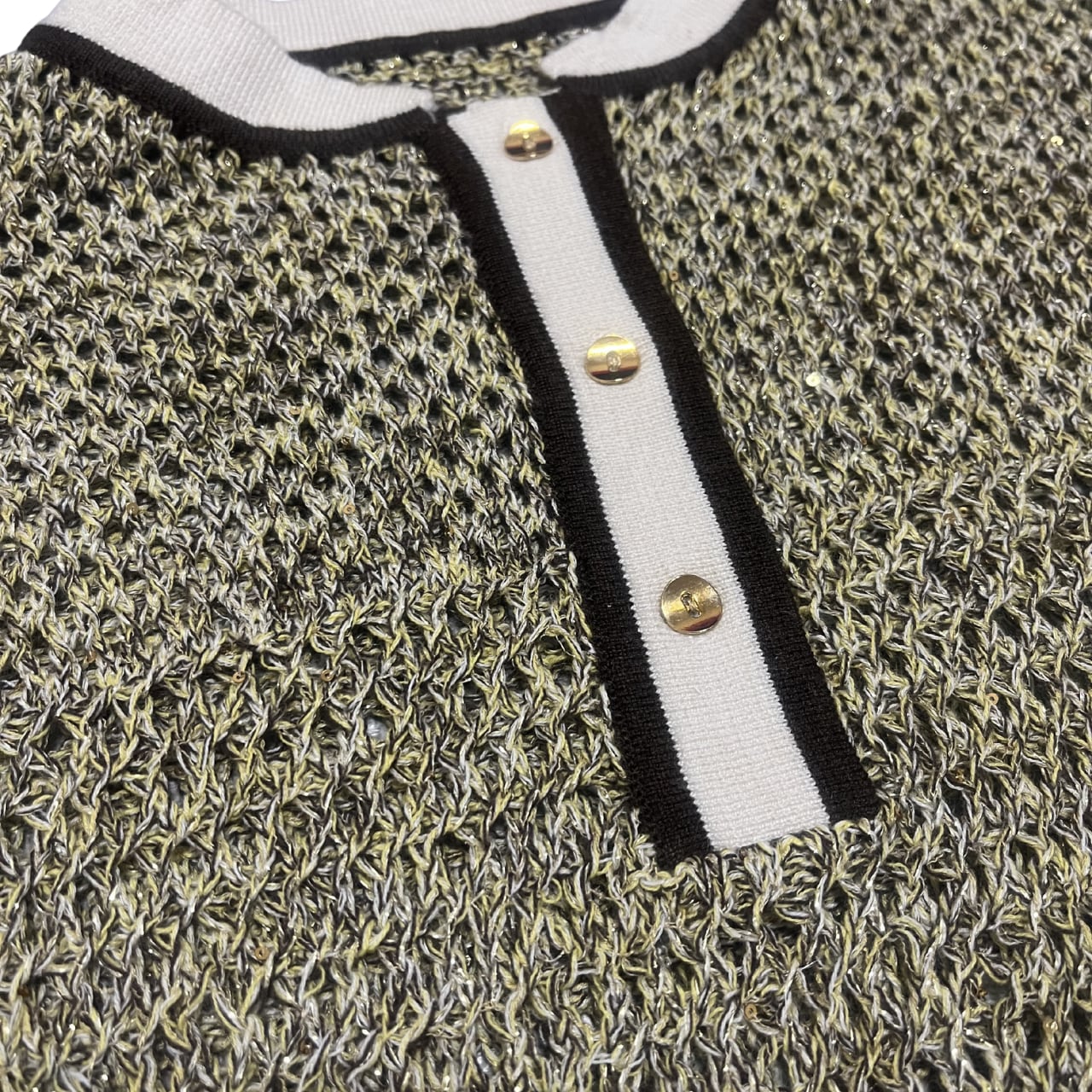 繊細なメッシュ編みが生み出すエレガントなテクスチャーが魅力的で、光の加減によって表情を変える上品な仕上がりになっています。メッシュの透け感が重ね着に立体感と動きを与えます。
