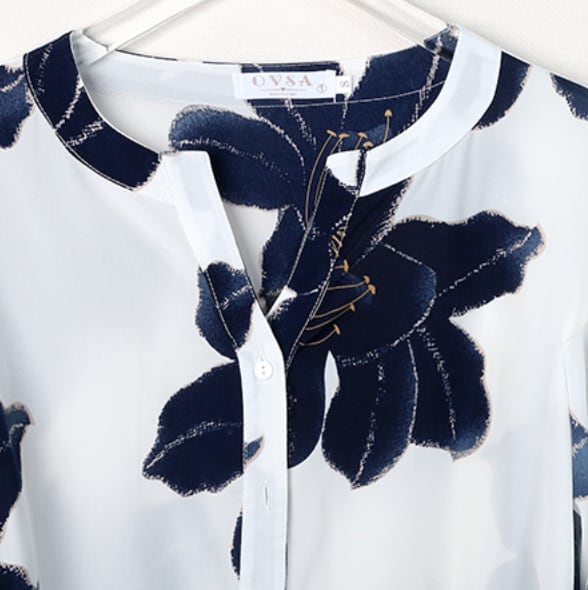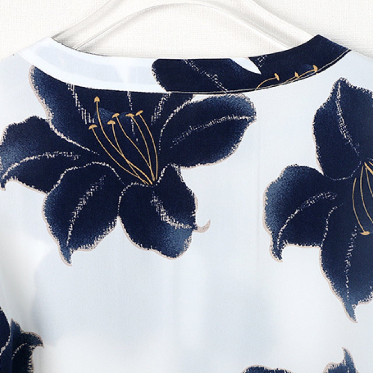 ホワイトベースにネイビーの花柄で、クラシックながらモダンな印象を与えます。首元を美しく見せるVネックラインで、女性らしい品格をプラス。