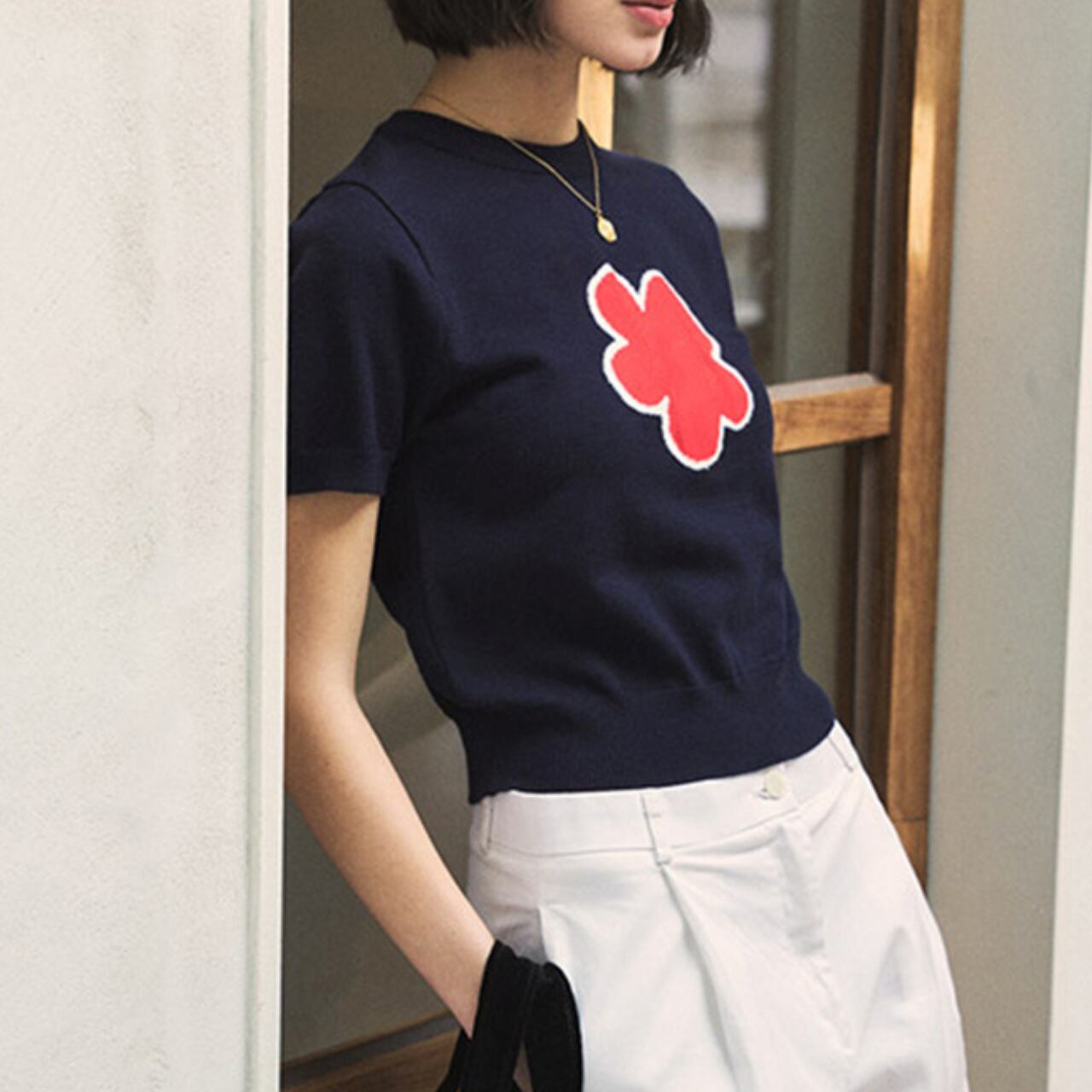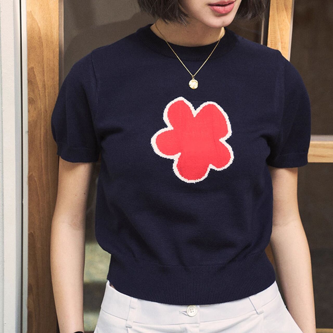 胸元の大きなレッドフラワーモチーフが、コーディネートの主役に!
