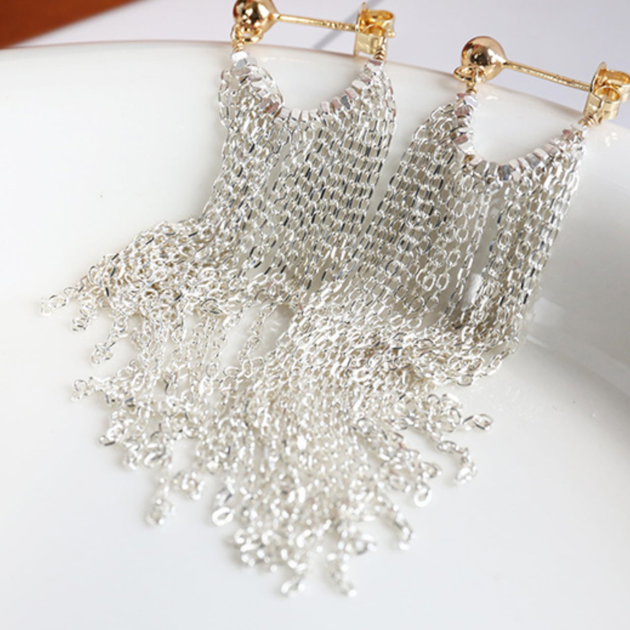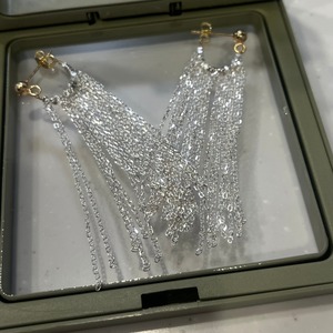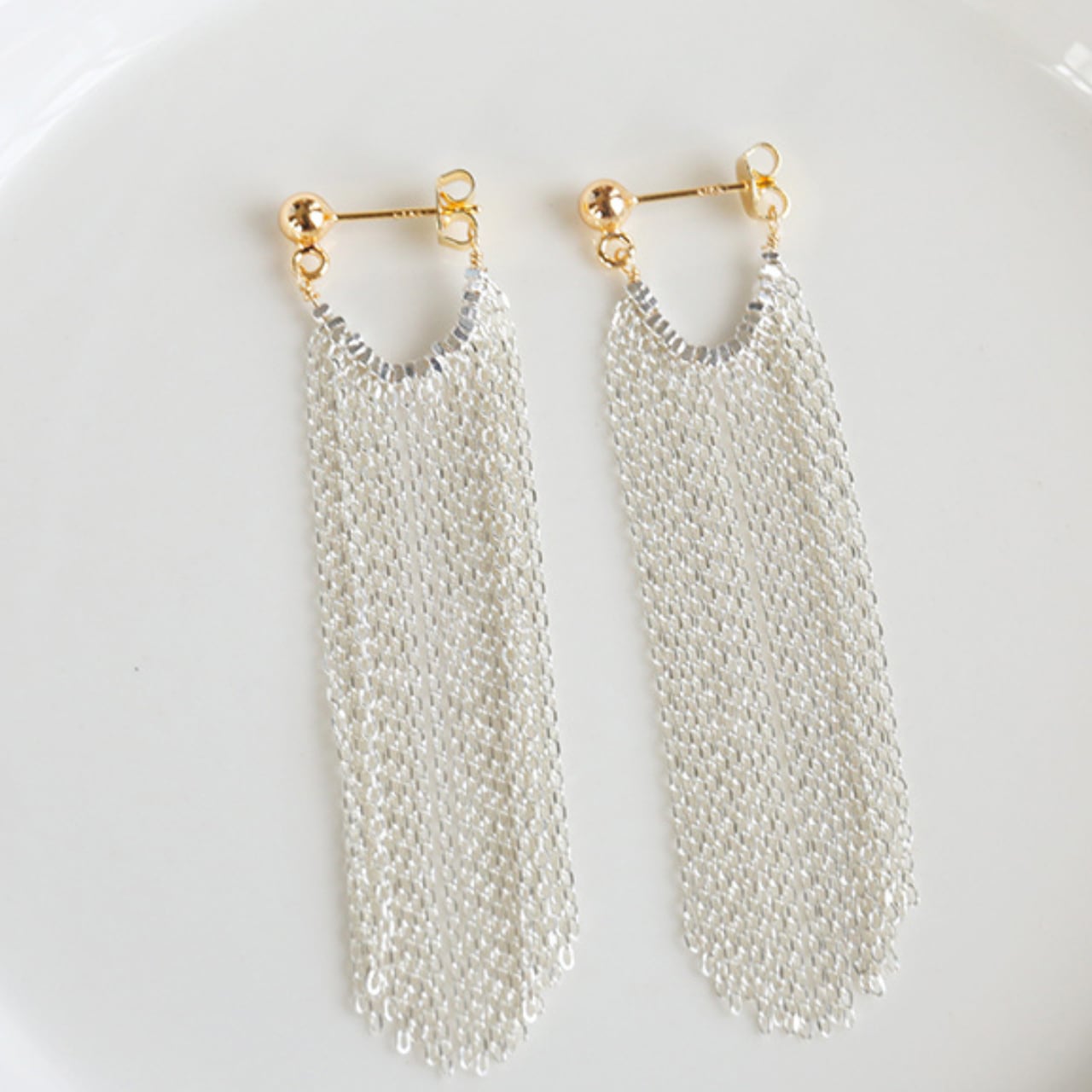 温かみのあるゴールドのフープパーツと、クールな輝きのシルバーチェーンタッセルの絶妙な組み合わせ。