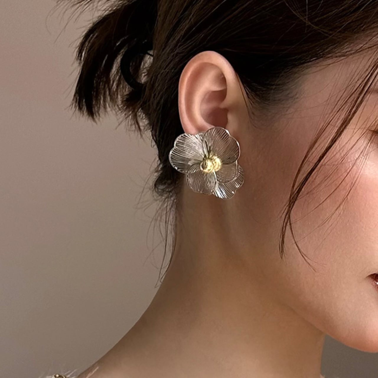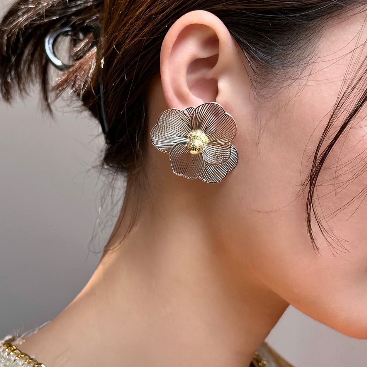 まるでレースのように繊細な透かし彫りで表現された大輪の花が、軽やかで上品な印象を与える特別なピアスです。