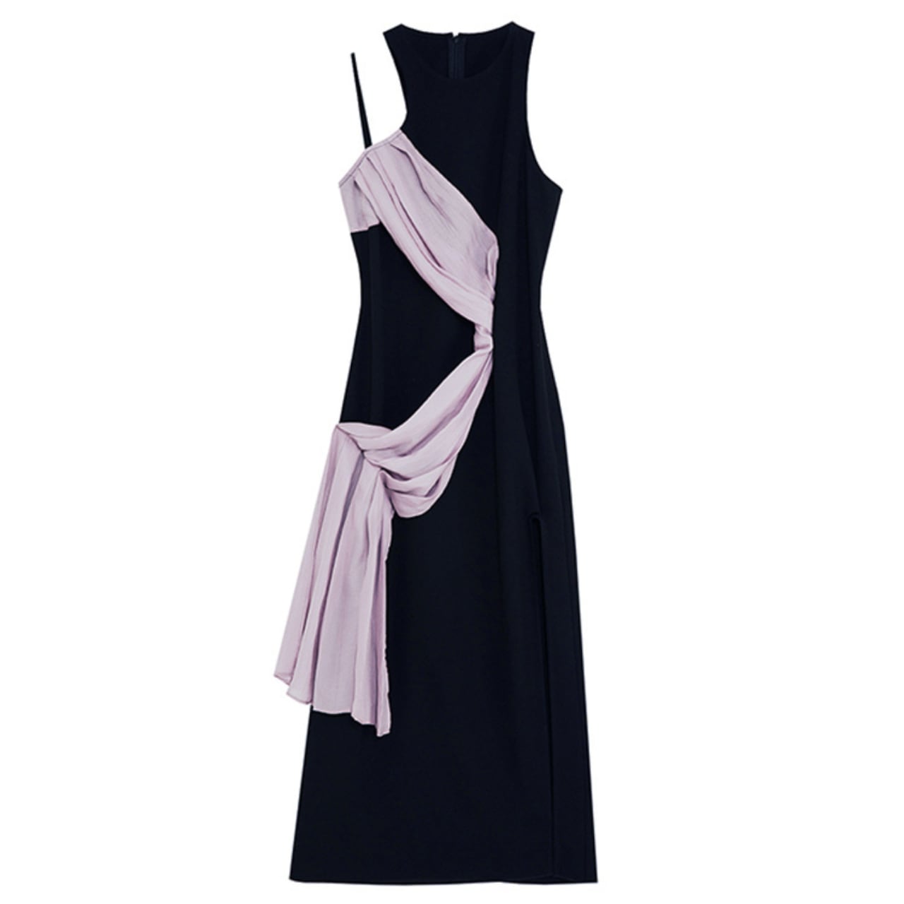 クラシックなブラックボディに、リボンが織りなすアシンメトリーなドレープが、モダンアートのような美しいシルエットを描きます。