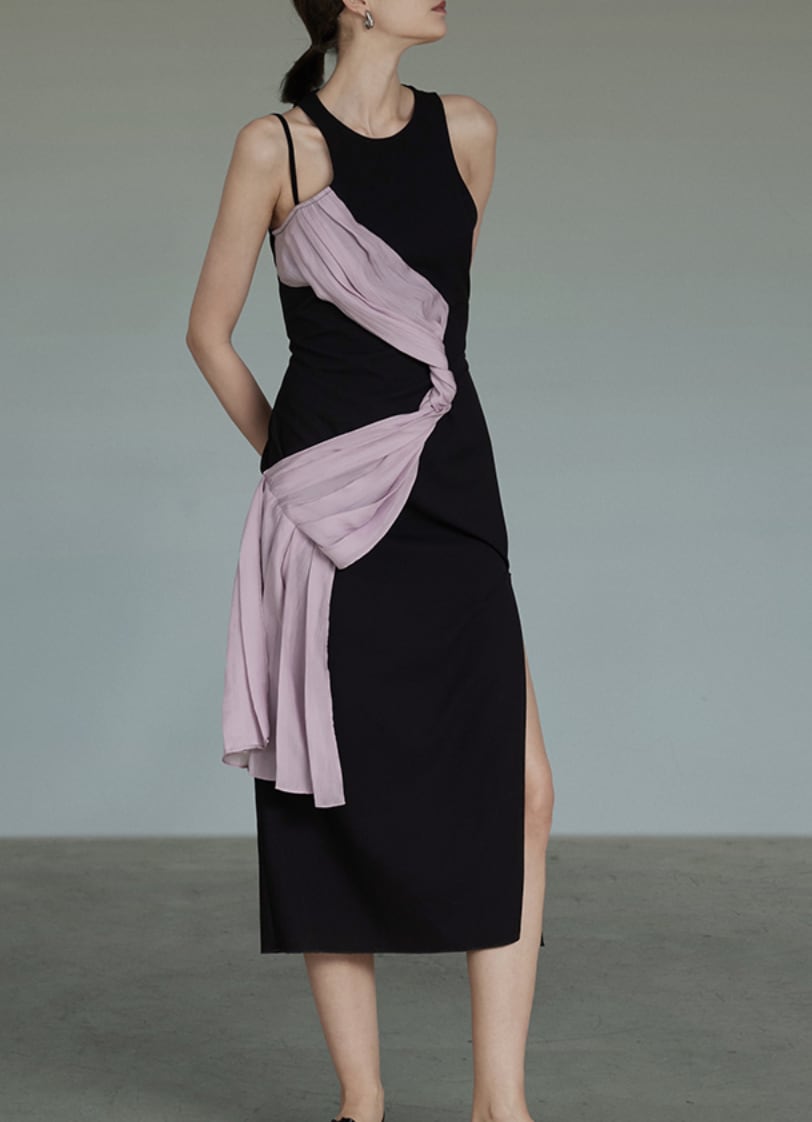 対角線に流れるリボンのラインが、ボディに立体的な動きと奥行きを与え、着る人を芸術作品のように美しく演出。