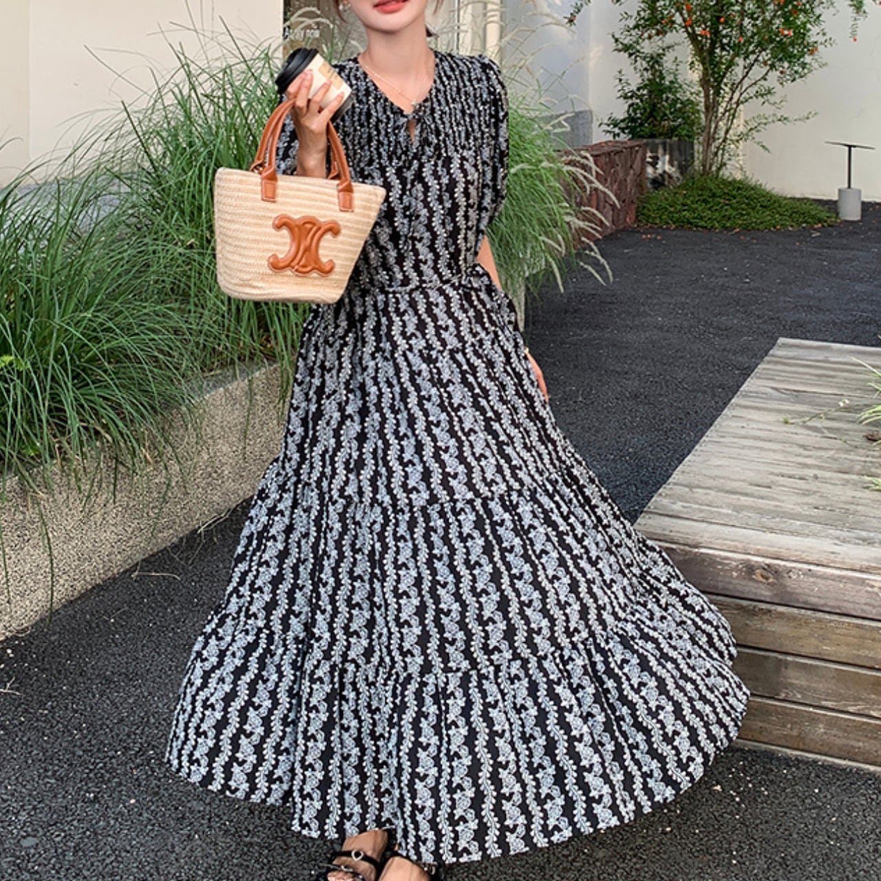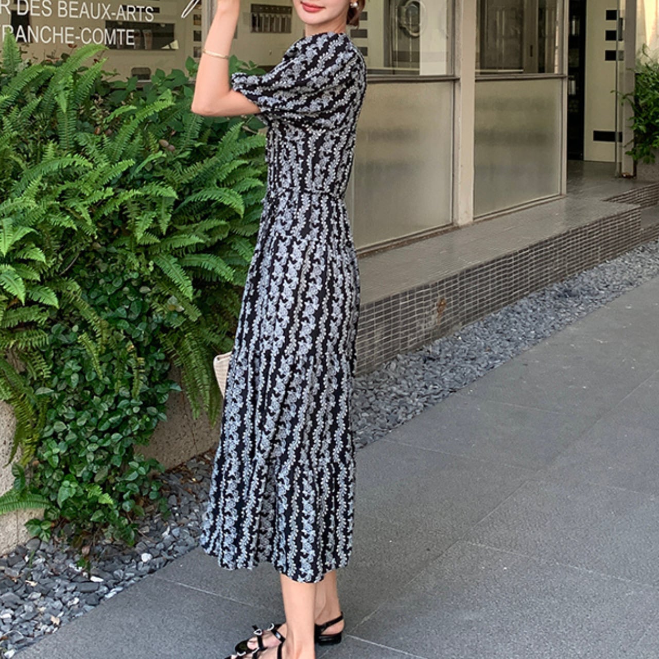 繊細な花柄プリントと流れるようなプリーツが織りなす、フェミニンエレガンスの極致を表現したマキシ丈ワンピース。