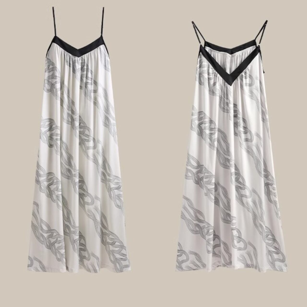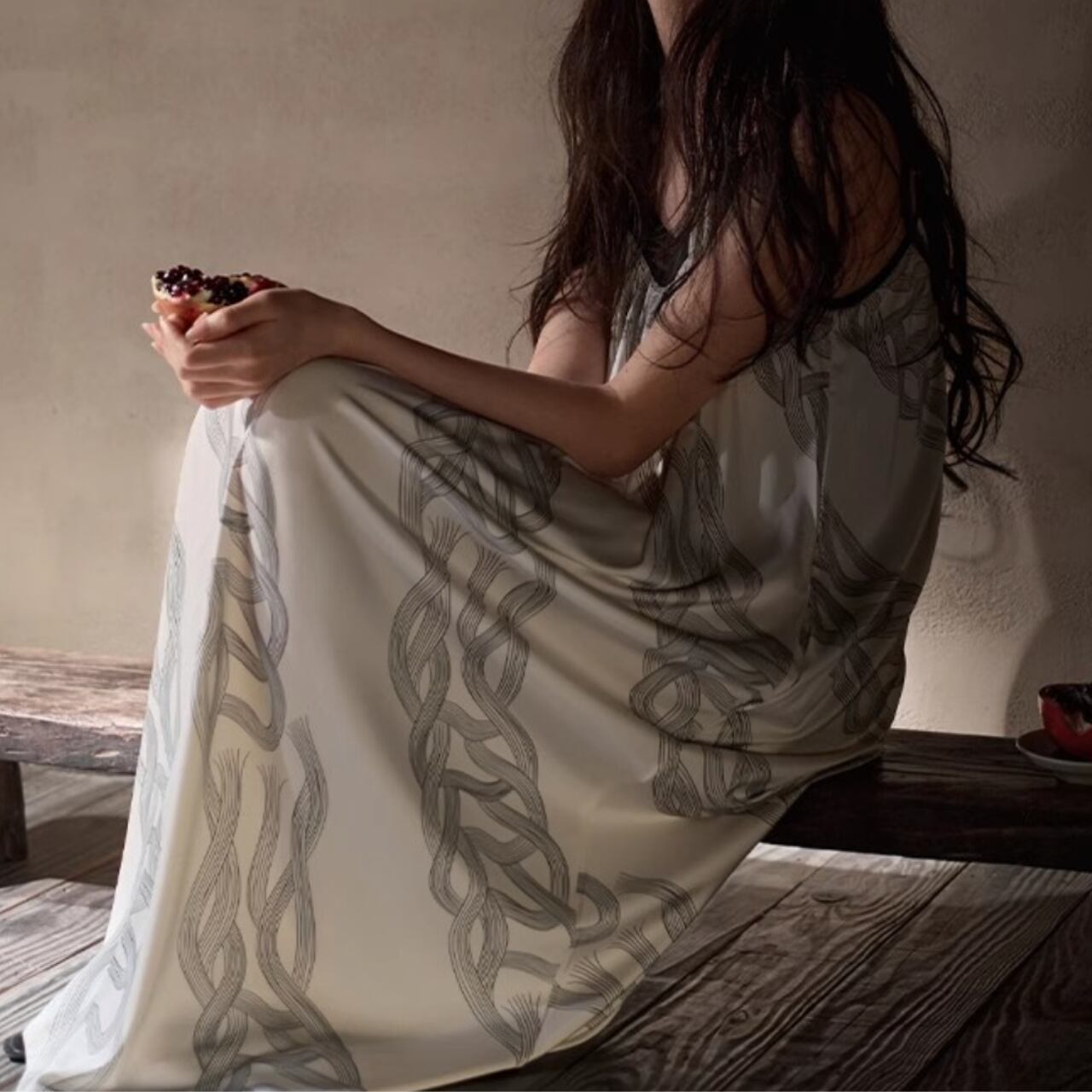 独特なねじりプリントが醸し出す現代的な美しさが際立つ一着です。流れるようなシルエットは、風に揺れながら女性らしい優雅さを表現します。