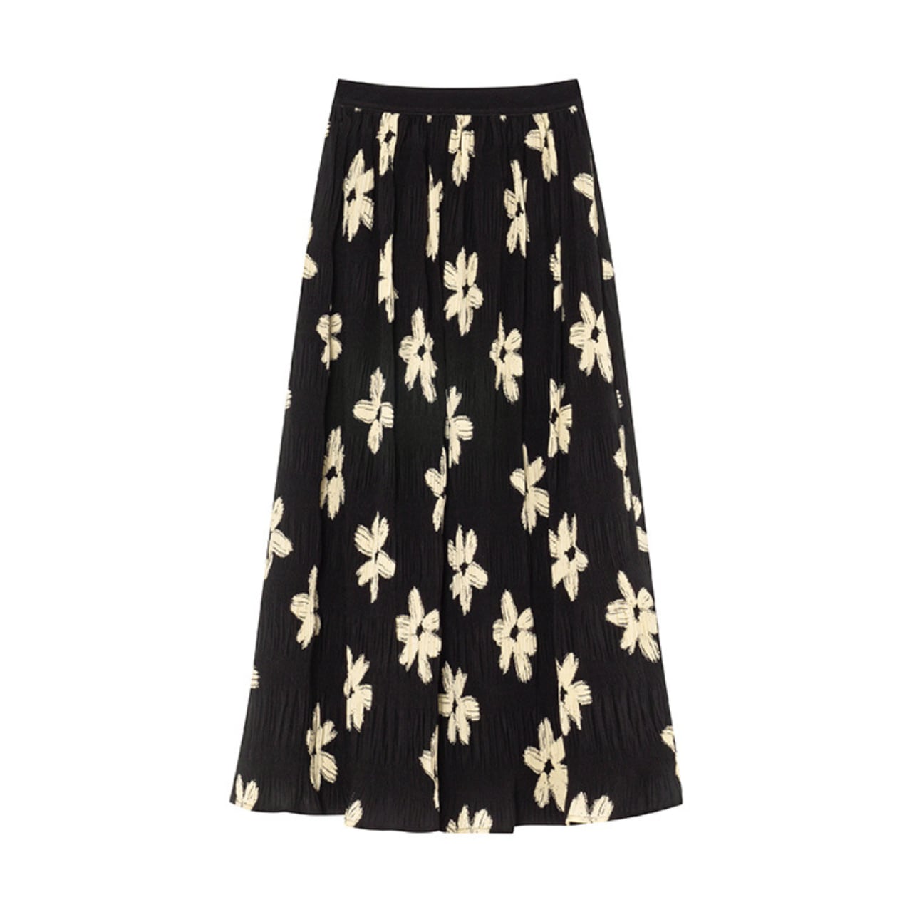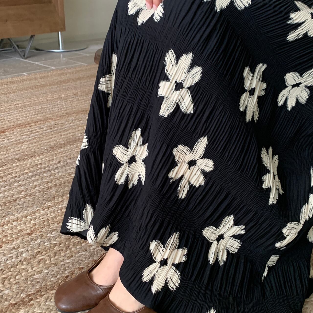細かなプリーツ加工により、歩くたびに優雅に揺れる美しいシルエットを実現。プリーツの陰影が花柄に立体感を与え、より一層華やかな印象を演出します。座った時のシワも目立ちにくく、一日中美しいドレープをキープ。