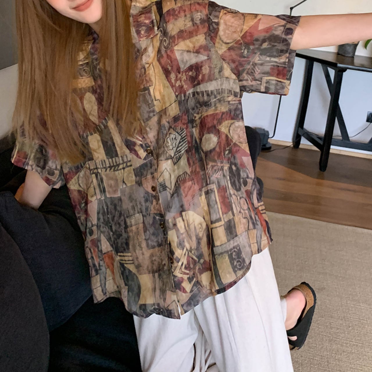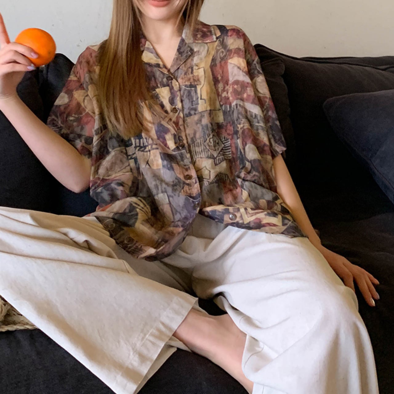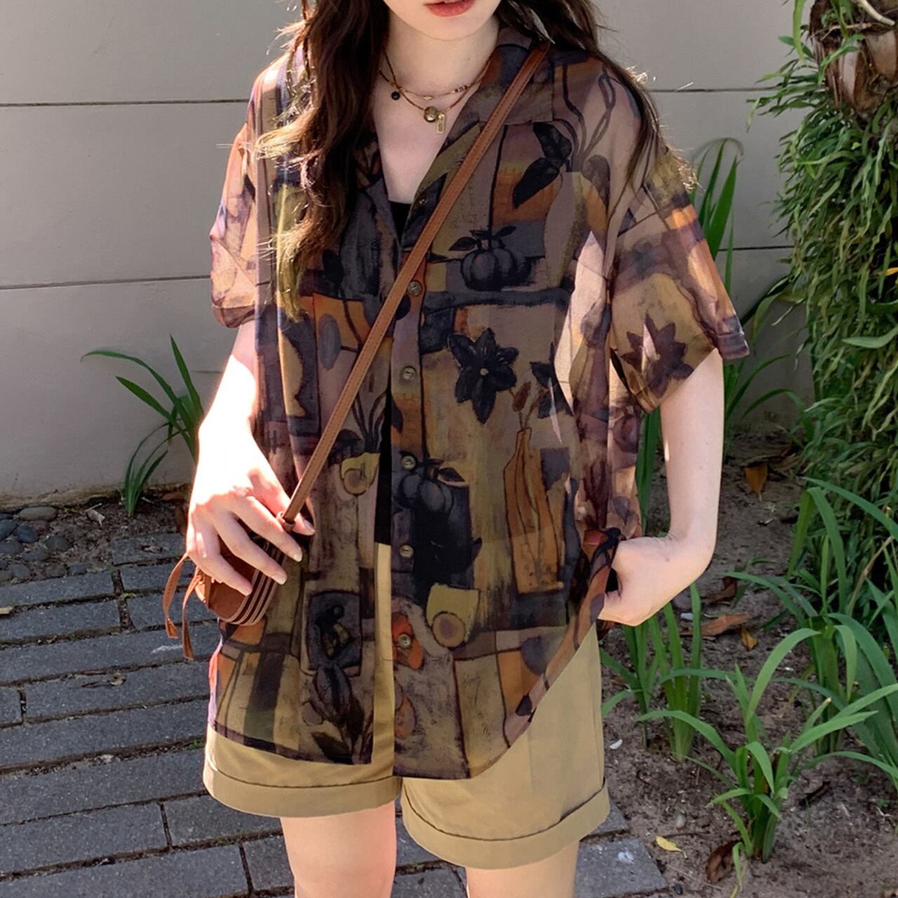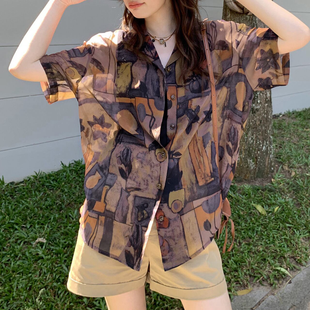複雑で豊かなプリントにより、シンプルなボトムスと合わせるだけで洗練されたコーディネートが完成。まさに「着るアート」として、あなたのワードローブに特別感をプラスします。