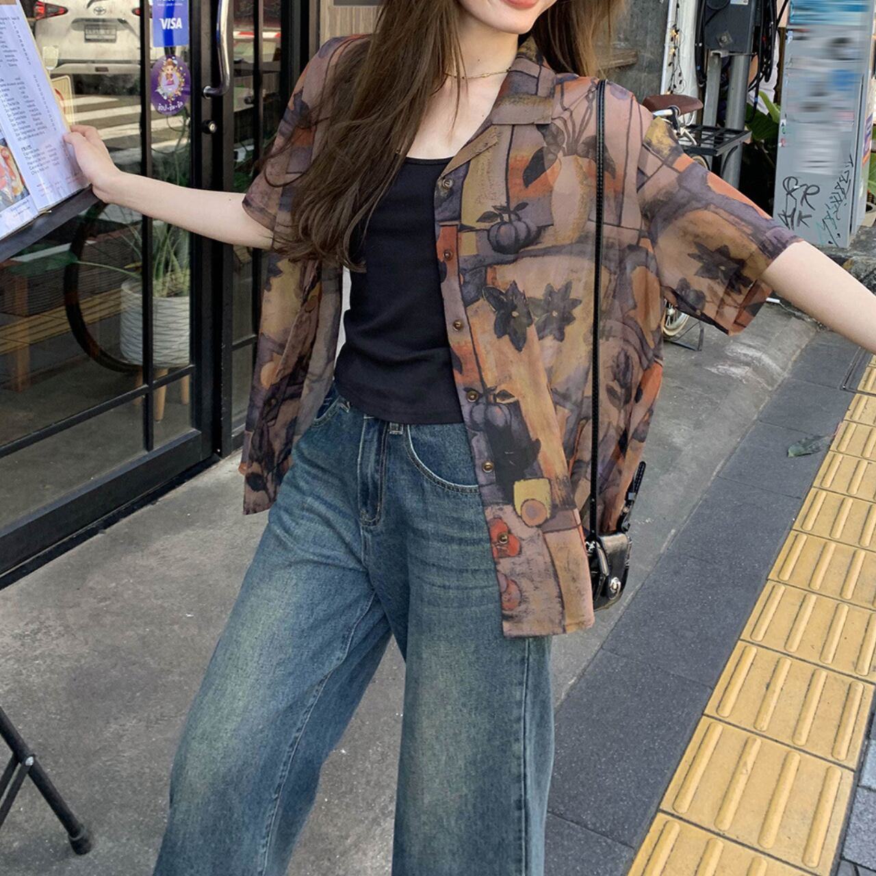 Vintage print open collar shirt in 2 colors S1134