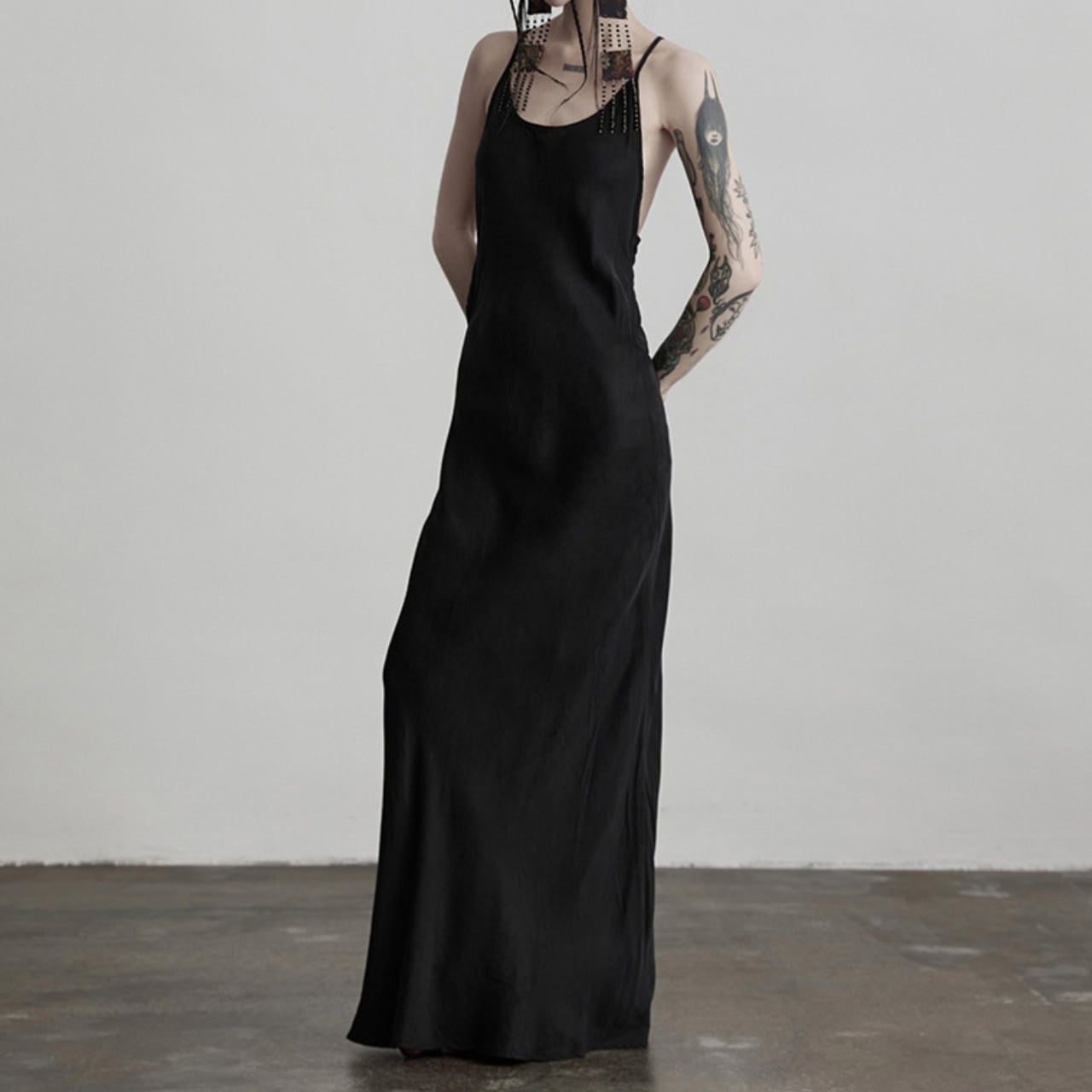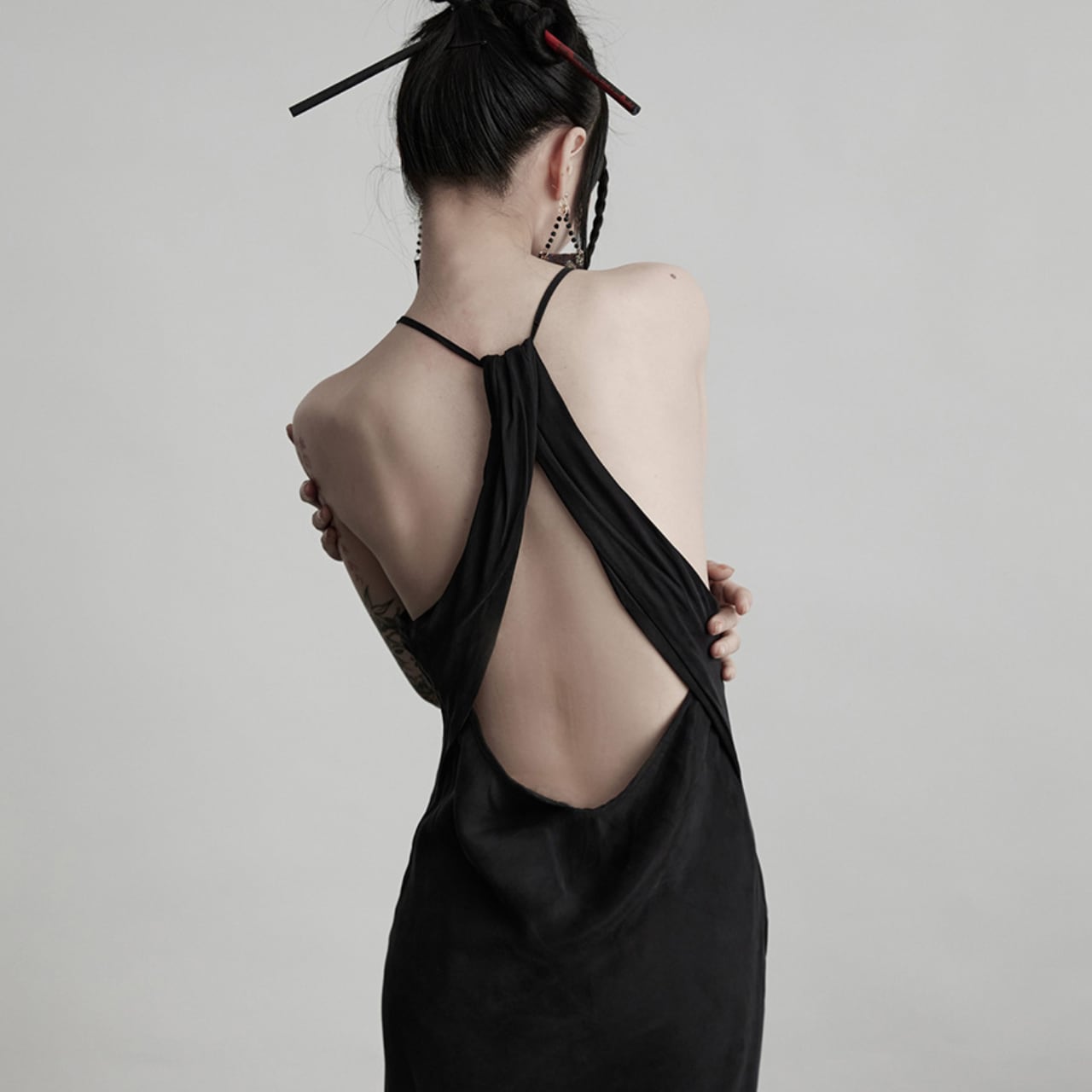フロントはミニマルに、バックは劇的に。計算されたカットオフデザインと交差するストラップが織りなす芸術的なシルエットで、着る人を特別な存在へと昇華させます。