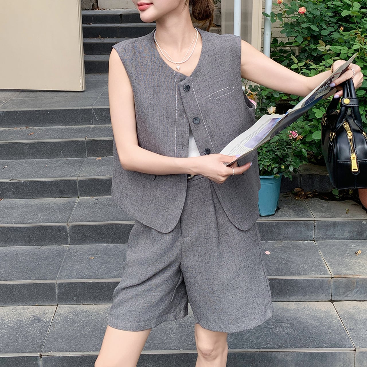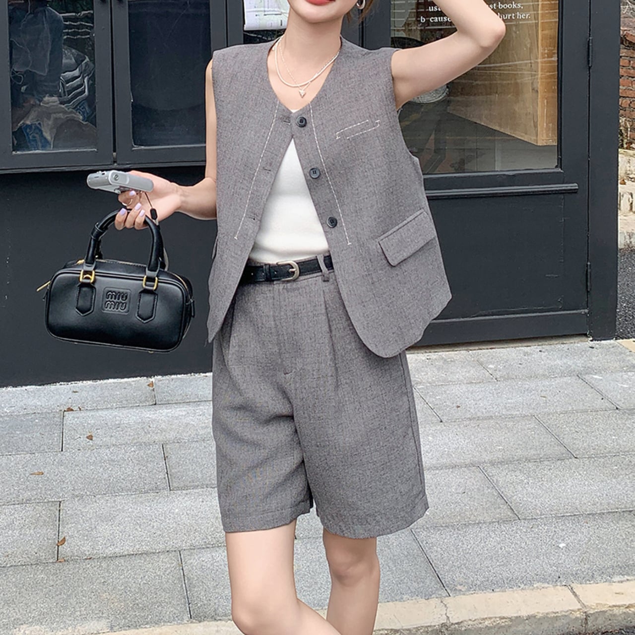 トラディショナルなベストとショーツパンツの組み合わせで、モダンなビジネスカジュアルスタイルを提案。きちんと感がありながら、今っぽい抜け感も演出できる大人女性のためのセットアップです。