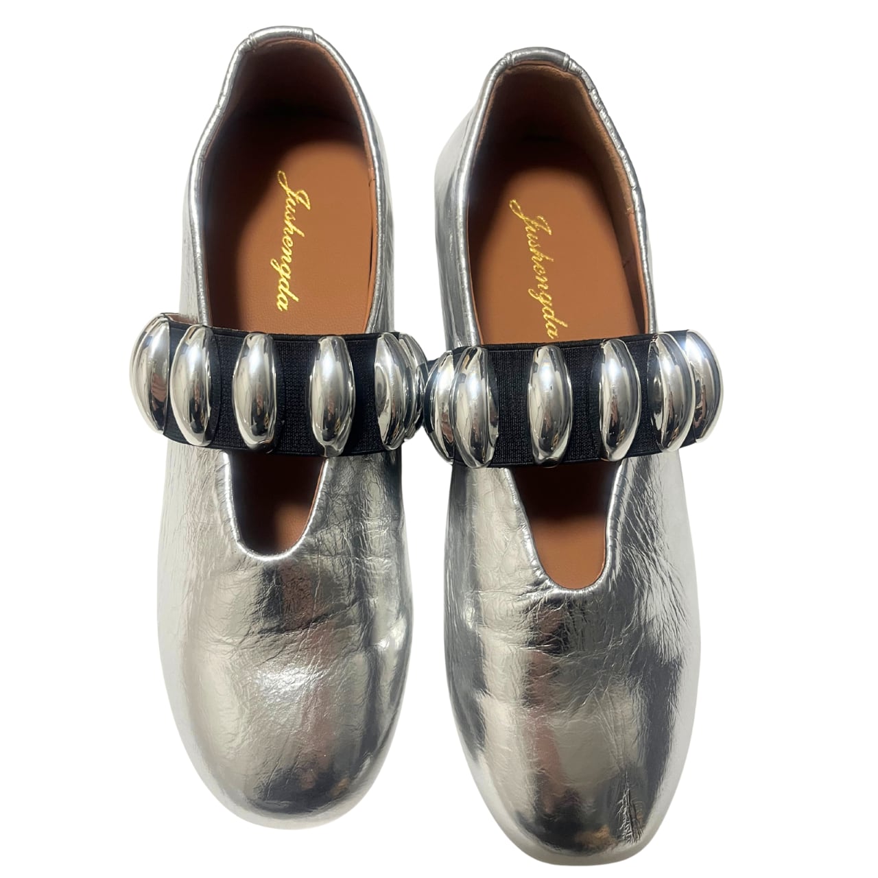 メタリックシルバーの輝きと、モダンなダブルストラップデザインが印象的なフラットシューズ。