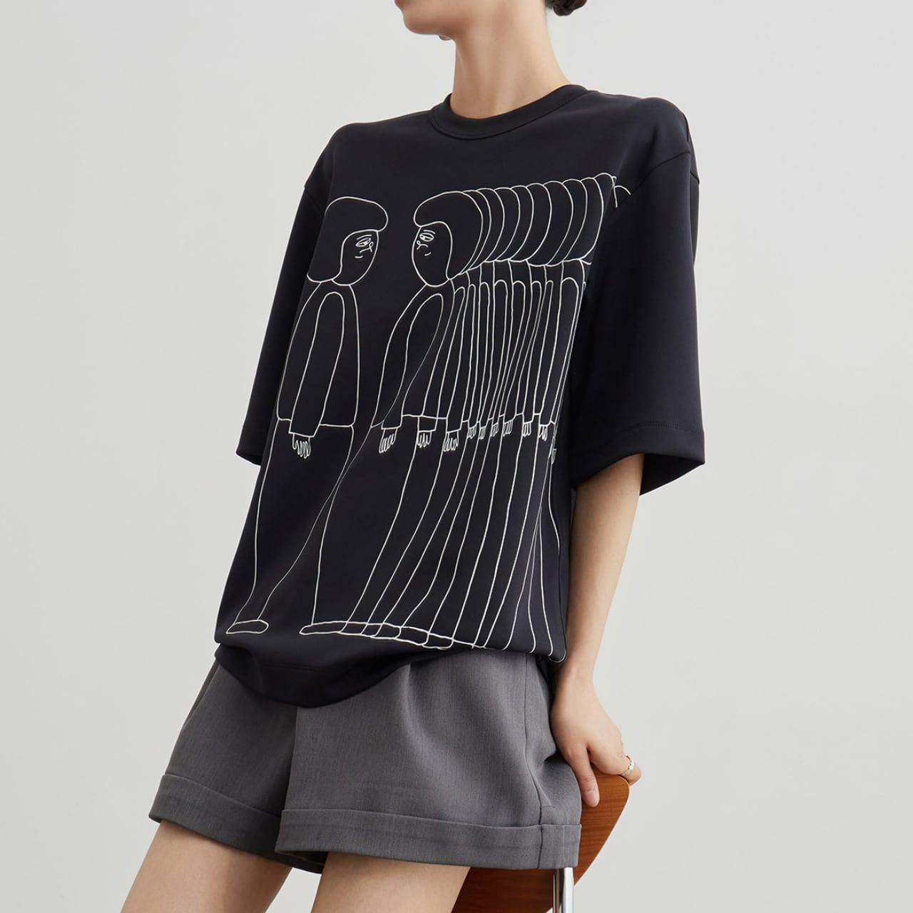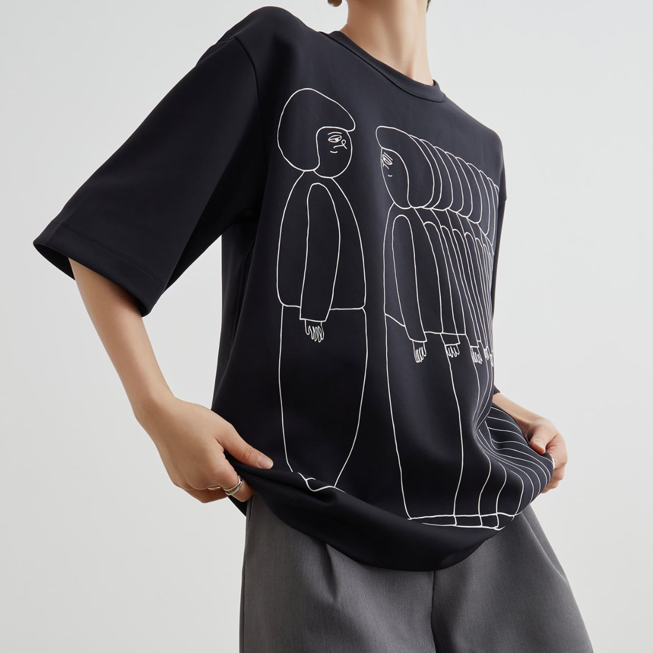 シンプルな線画で描かれた人物のシルエットが目を引く、モード感溢れるグラフィックTシャツ。抽象的でありながらも表情豊かなアートワークは、着る人の個性と感性を際立たせます。