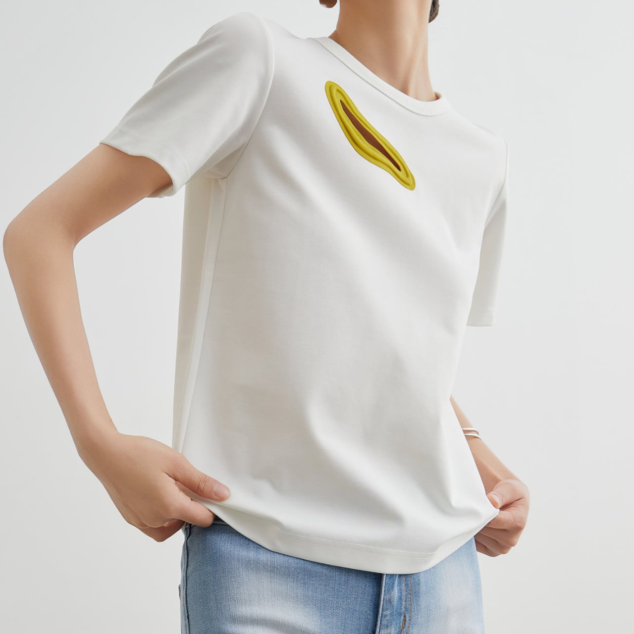 胸元にさりげなくデザインされたイエローのホローアウト。シンプルながらもユニークなデザインで、コーディネートのアクセントになる一枚です。