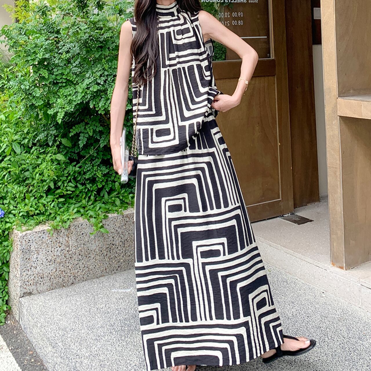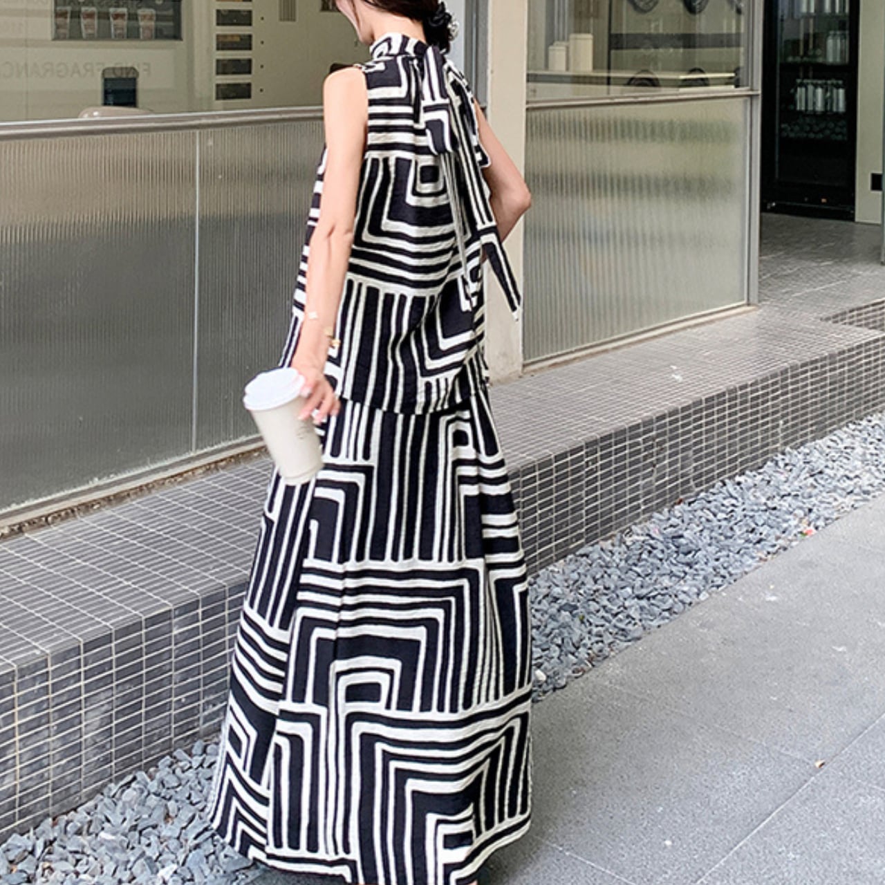 迷路のような幾何学模様が目を奪う、ハイネックトップス&ロングスカートのツーピースセット。黒と白のコントラストが生み出す視覚的インパクトで、着る人を一瞬でスタイリッシュに変身させます。