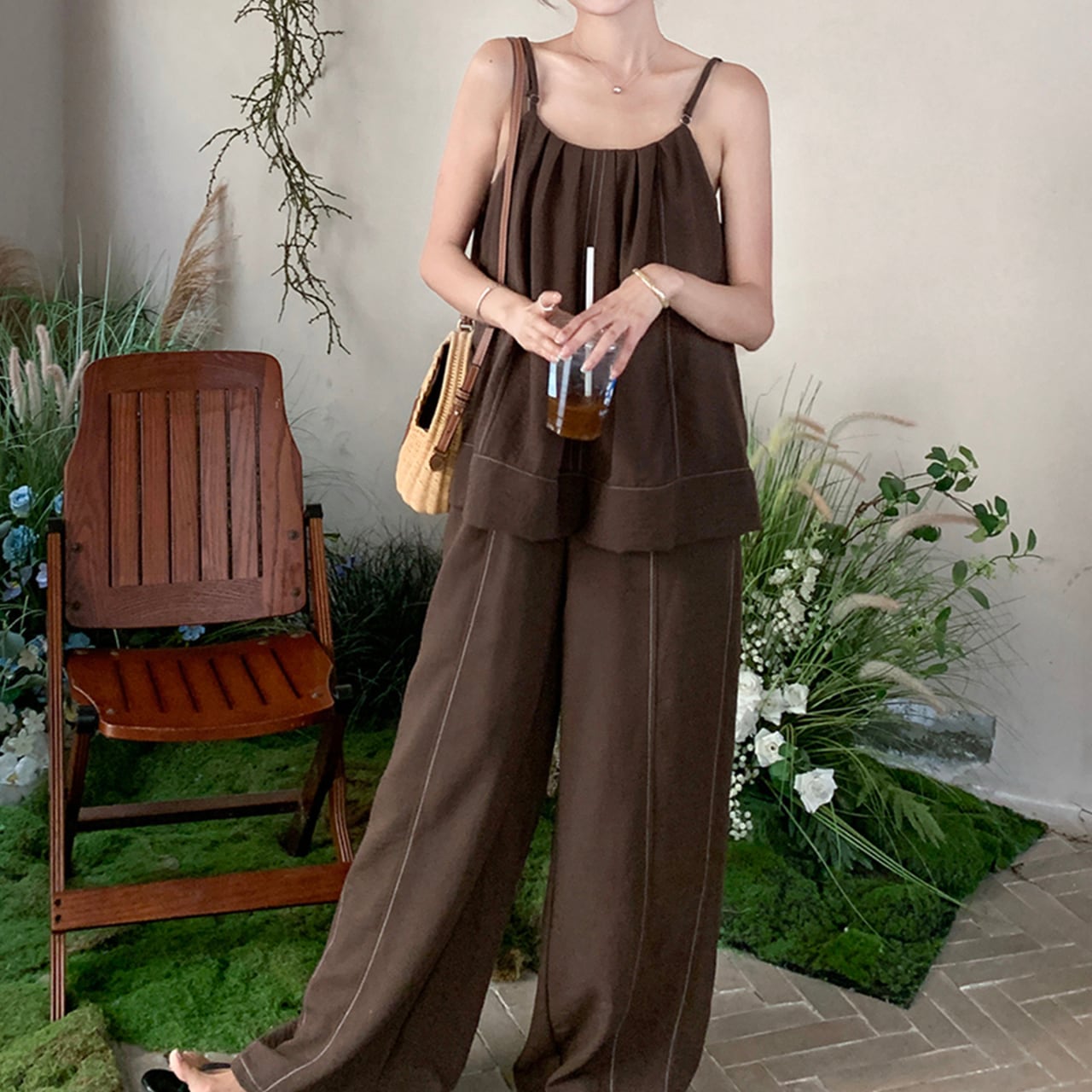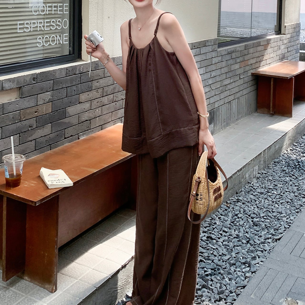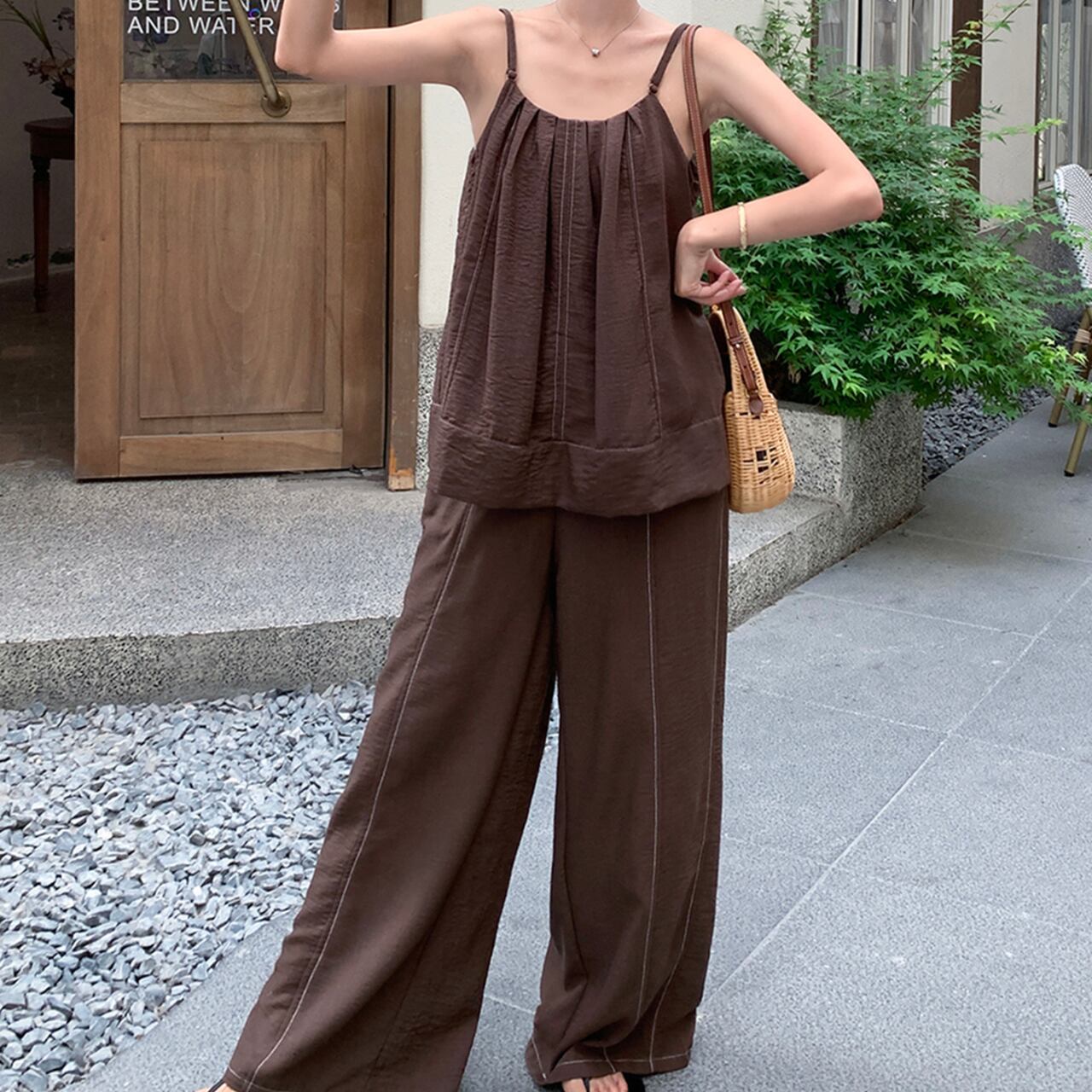 ブラウンのキャミソールとワイドパンツのセットアップ。