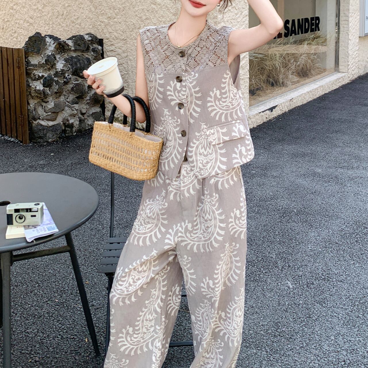 透かしデザインベスト&ワイドパンツセット。