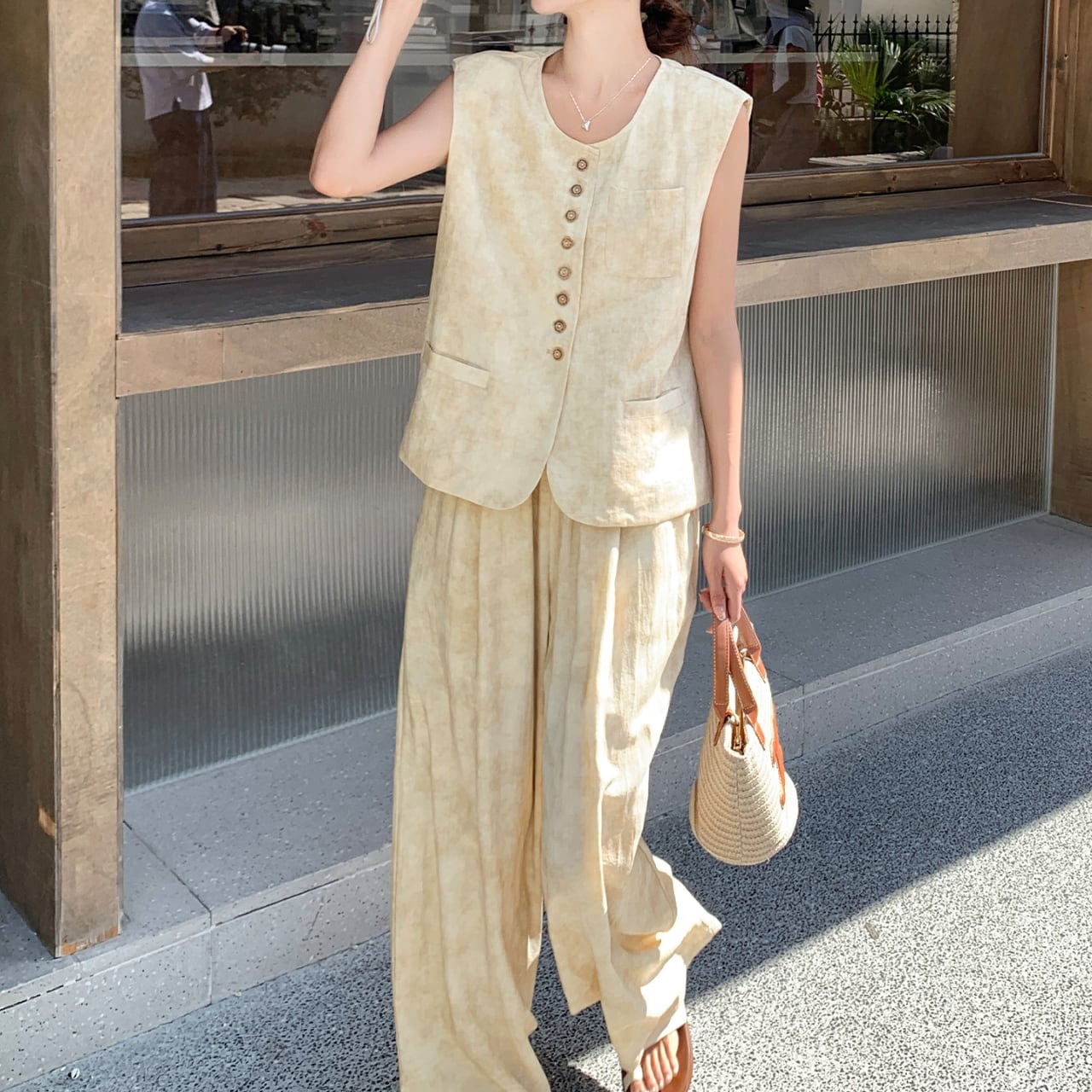 ベストはフロントのボタンディテールが印象的で、トラディショナルな魅力と現代的なシルエットを融合。ノースリーブで涼しく、レイヤードスタイルにも最適です。
