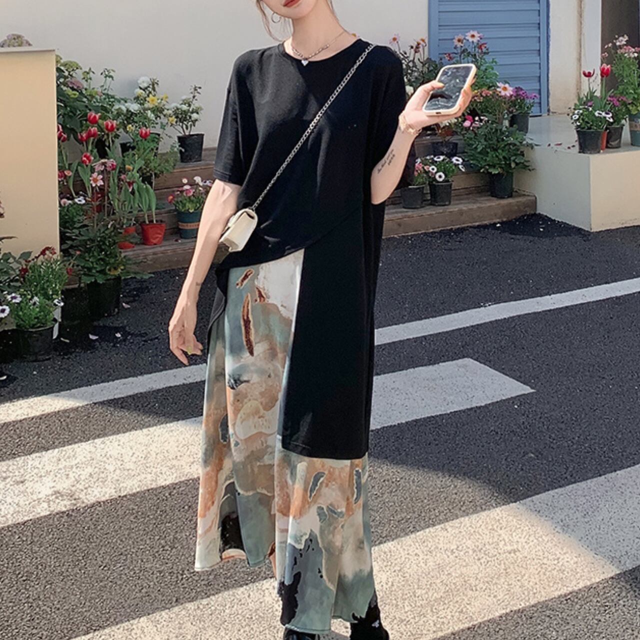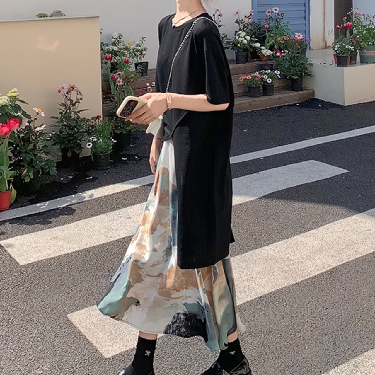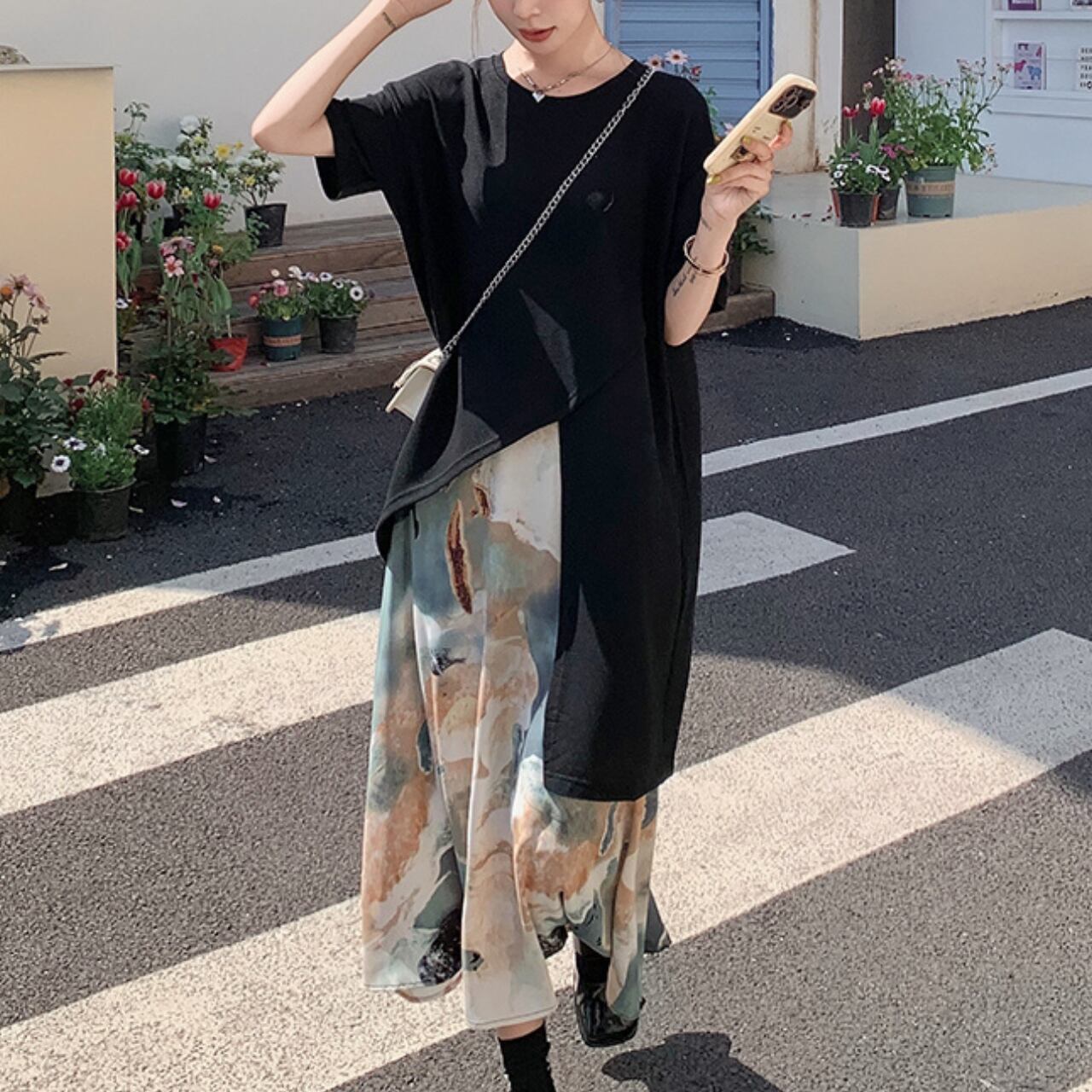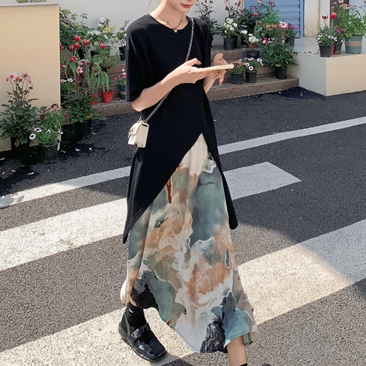 水彩画のような美しいアート柄スカートと、着回し力抜群のベーシックブラックTシャツのセット商品。
