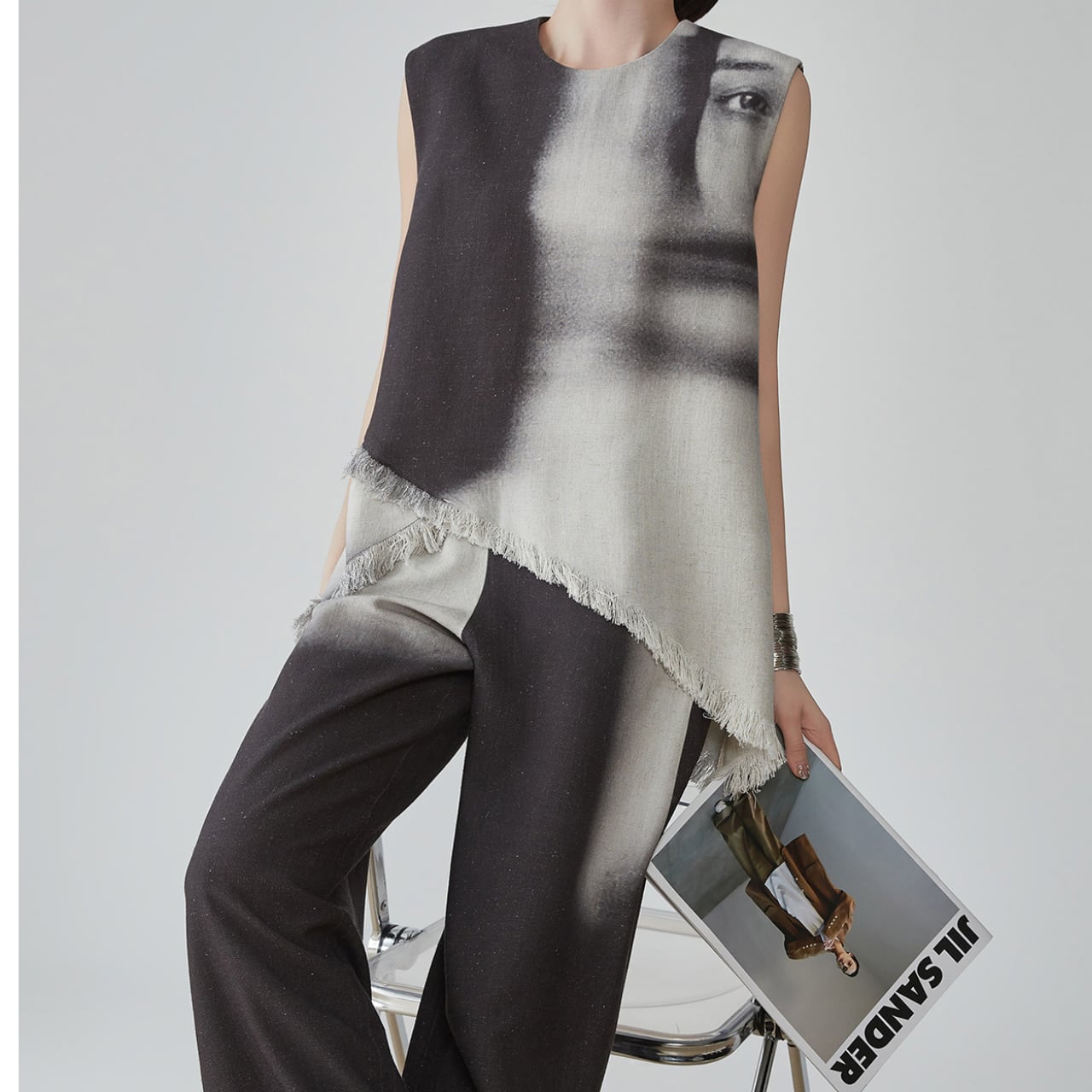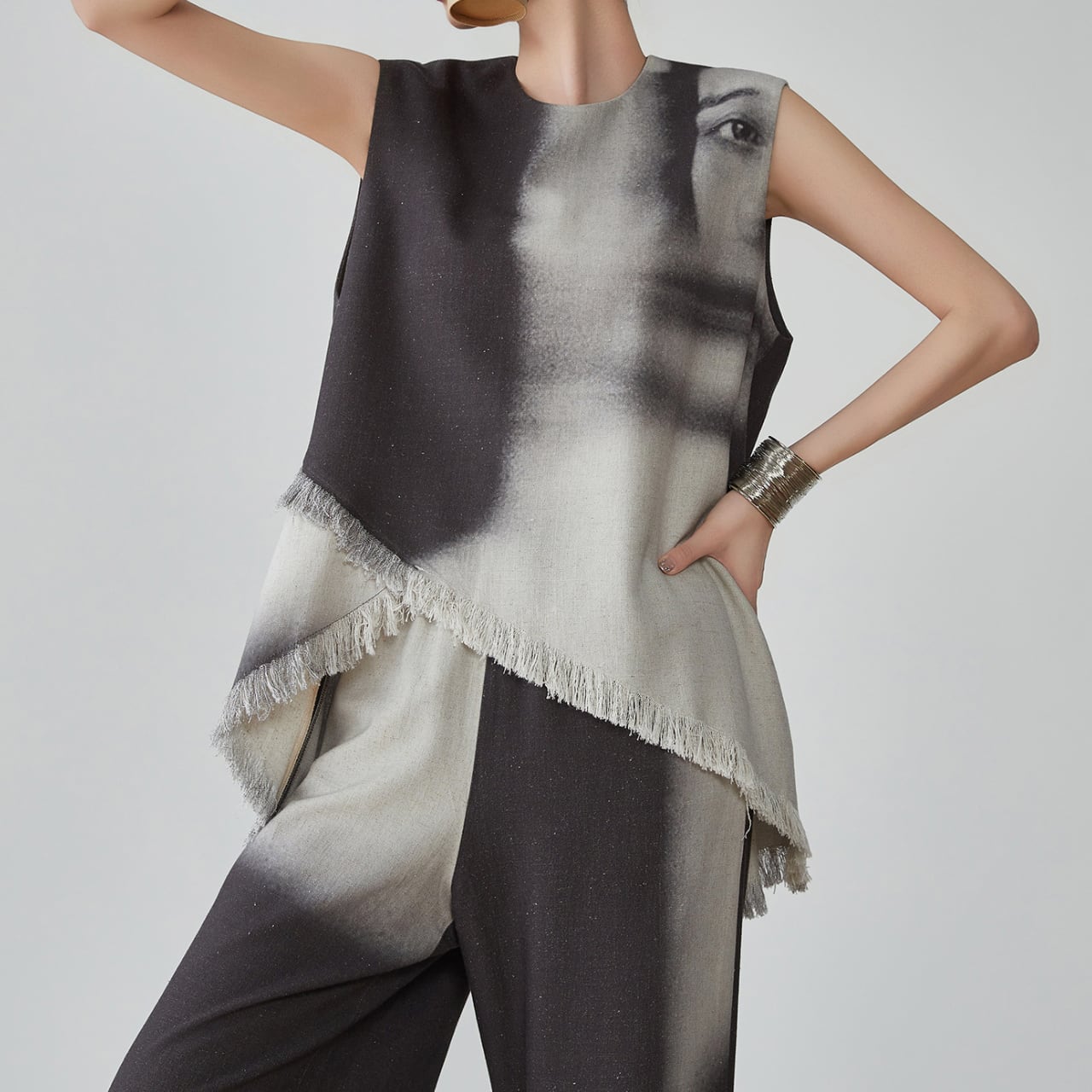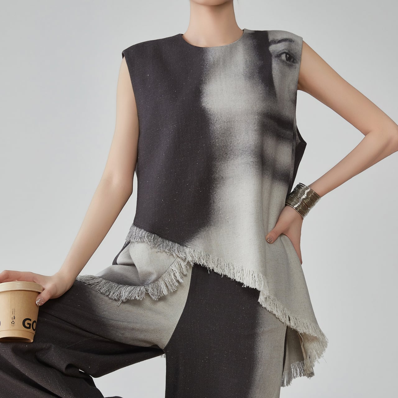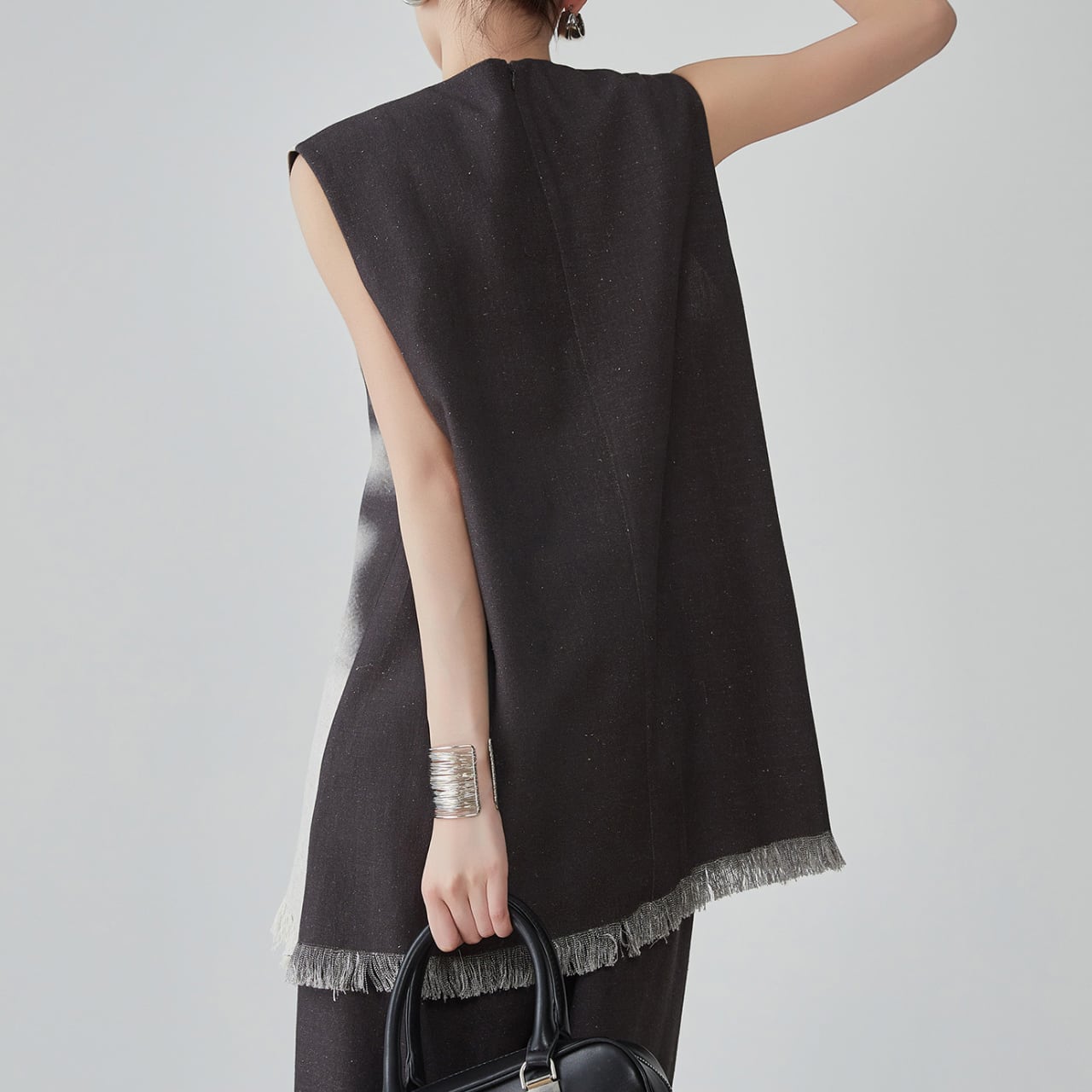 グレートーンの上品な色合いに、繊細なタッセルディテールが美しく映えるパッチワークベスト。