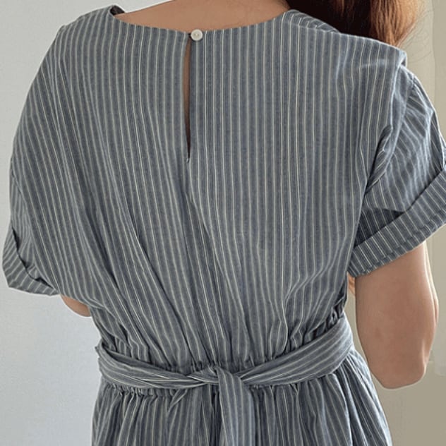 上品なストライプ柄とウエストのクロスリボンデザインが絶妙にマッチした、女性らしさと洗練さを兼ね備えたワンピース。