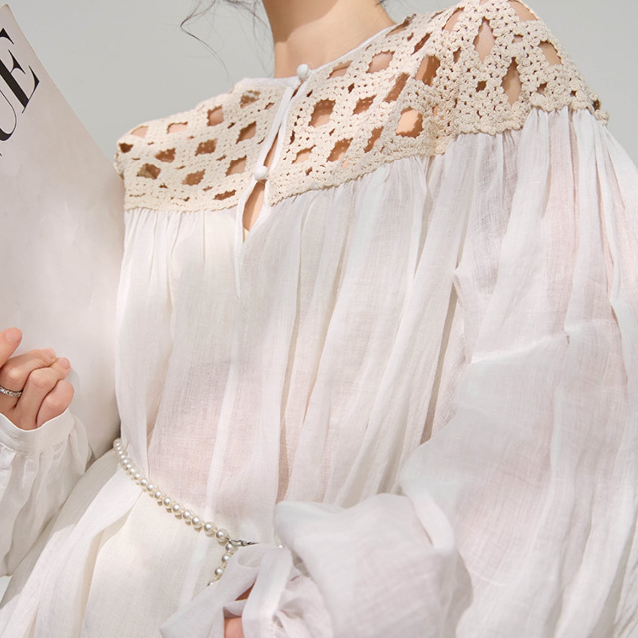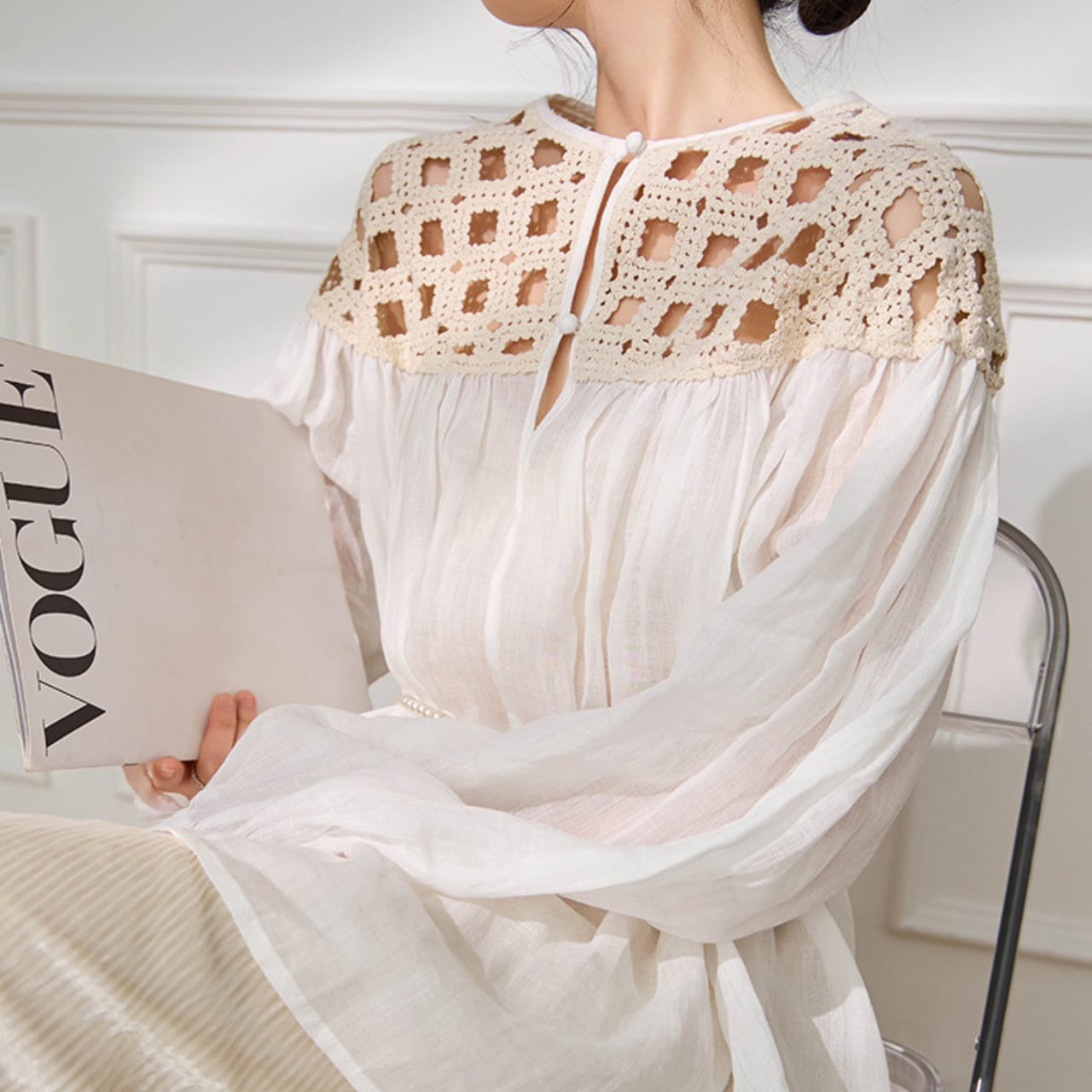 胸元から肩にかけて施された精緻なカットワークが、光と影の美しいコントラストを演出。