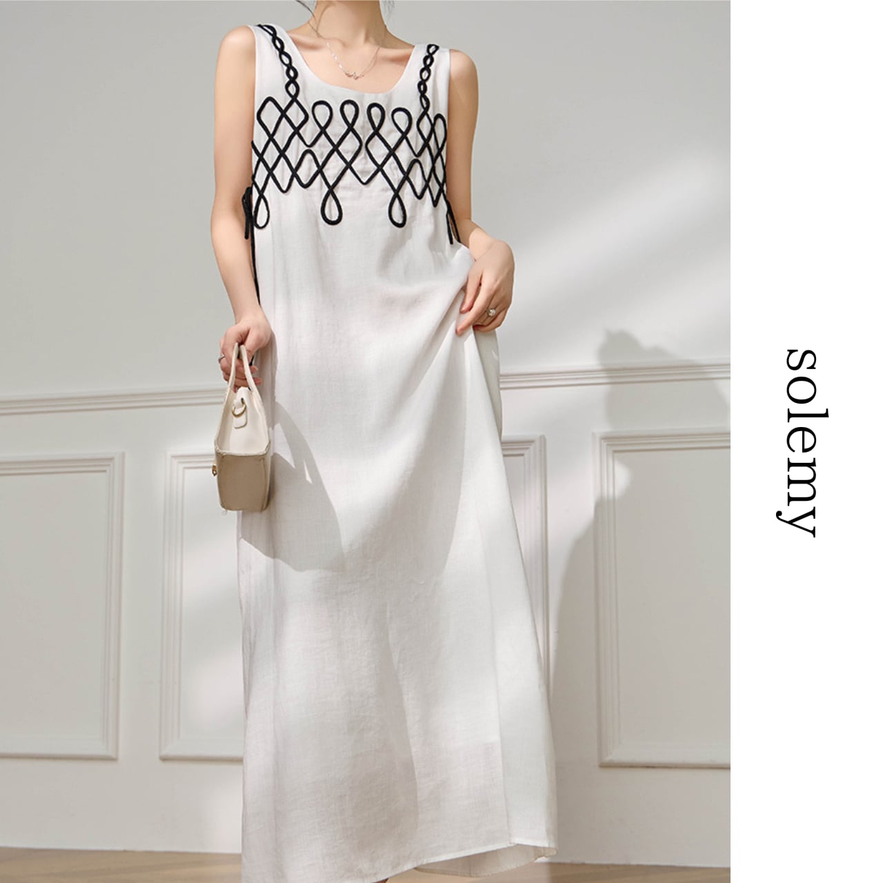 胸元からショルダーラインにかけて施された立体的なコード刺繍が、シンプルなホワイトベースに高級感溢れるアクセントを演出。太めのコード糸を使用した刺繍技術により、平面的ではない奥行きのある美しいデザインが、一枚で存在感のあるスタイリングを実現します。