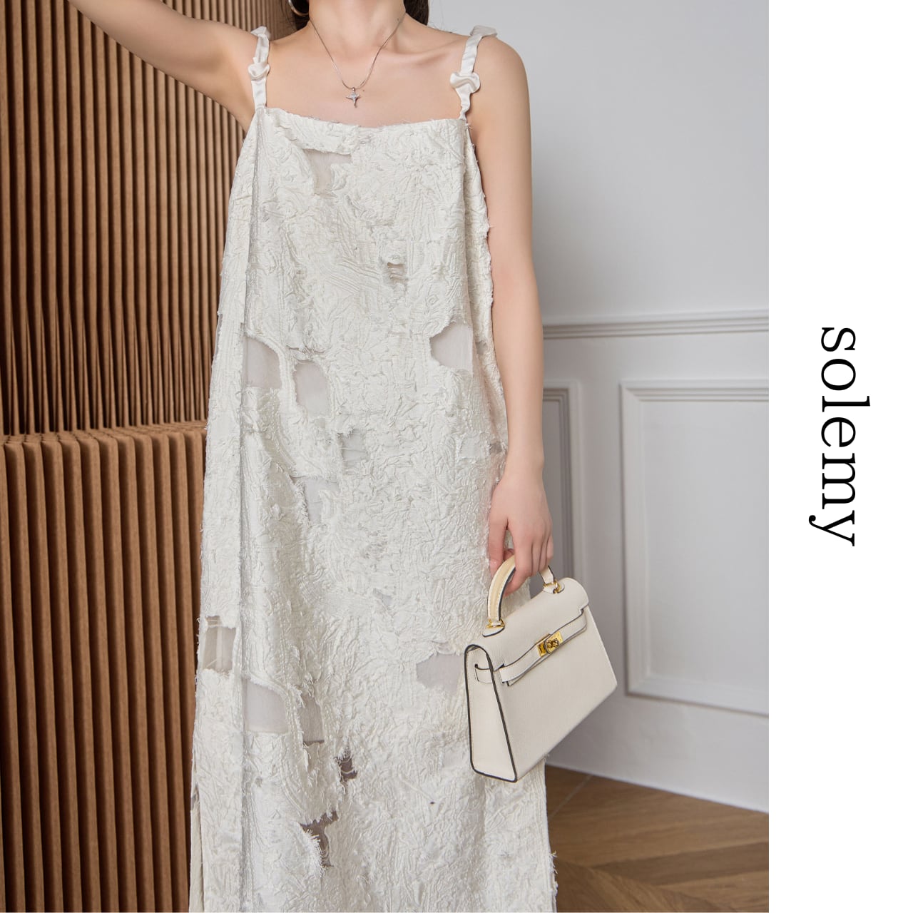 まるでアート作品のような美しさを演出する立体的なデザイン。光の当たり方によって表情を変える、奥行きのあるテクスチャーが、着る人を特別な存在へと昇華させます。