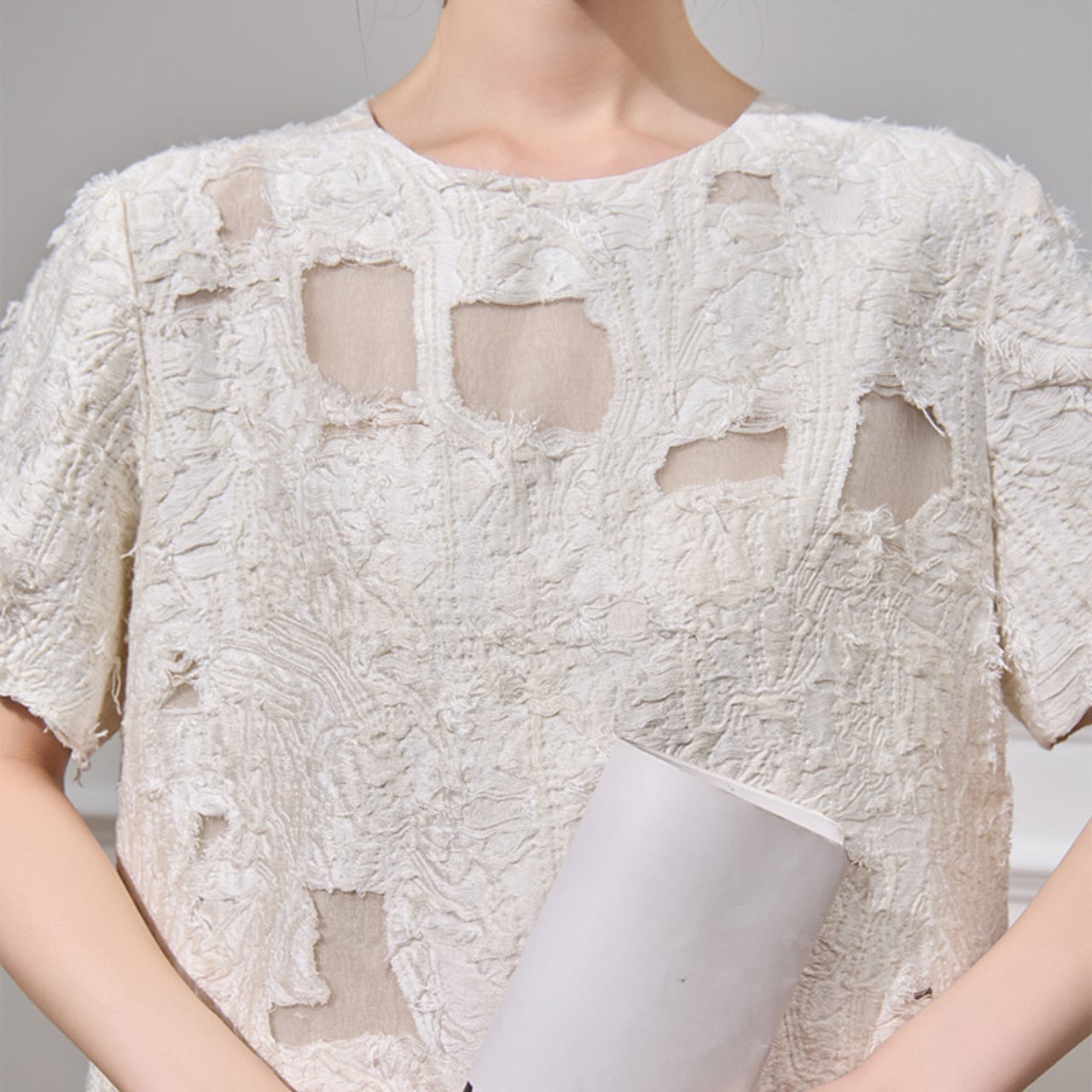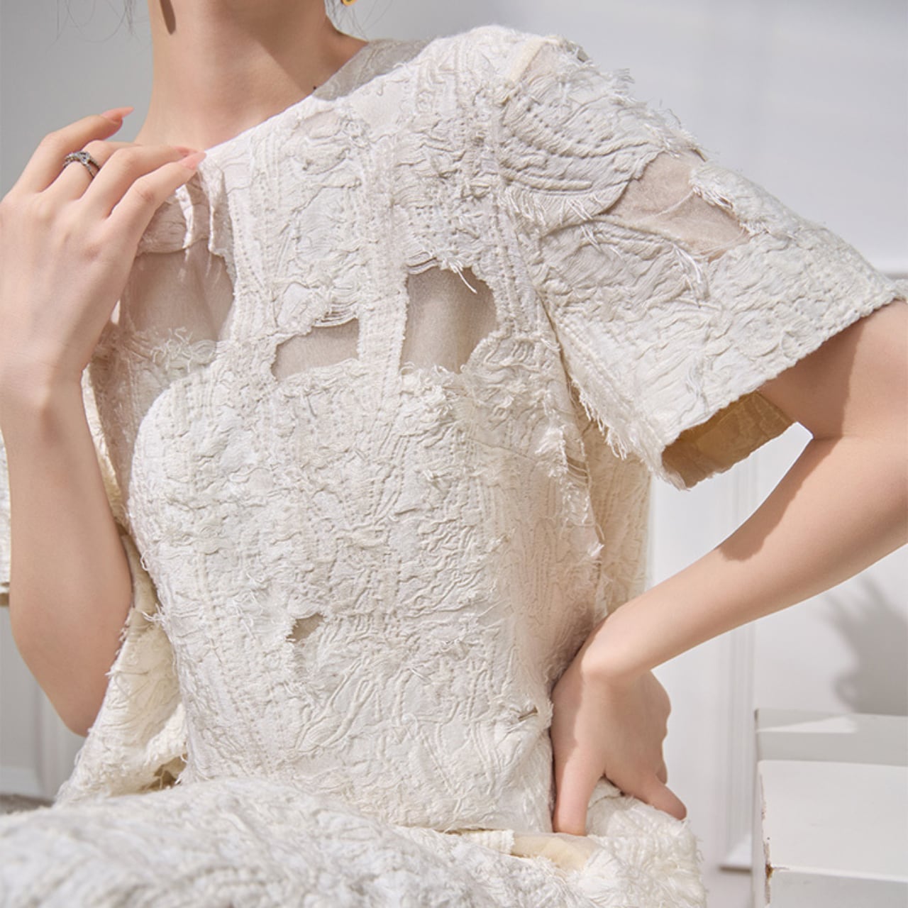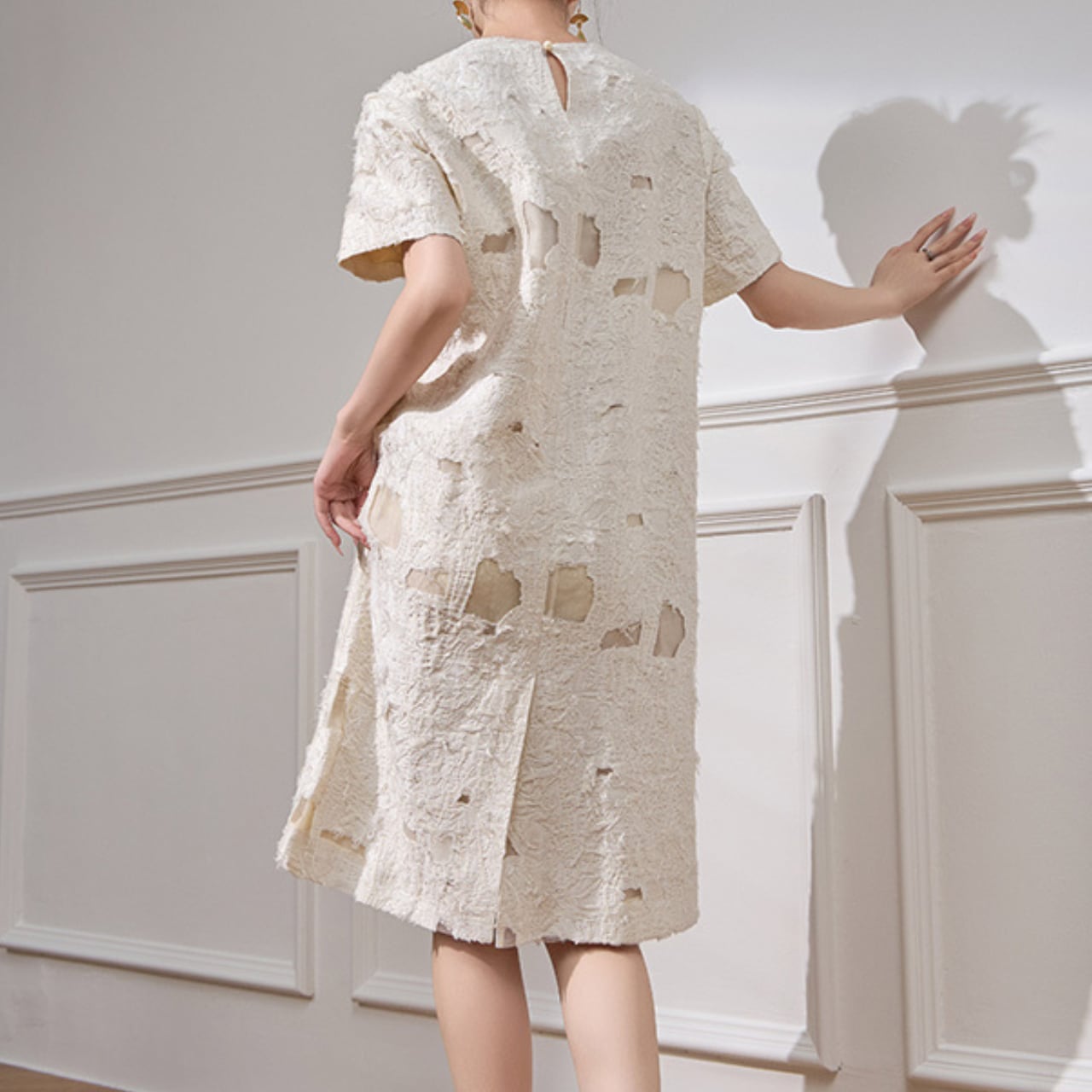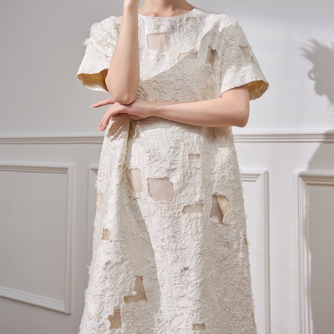 立体的なテクスチャーが生み出す陰影と、上品なホワイトカラーが織りなす洗練されたワンピース。