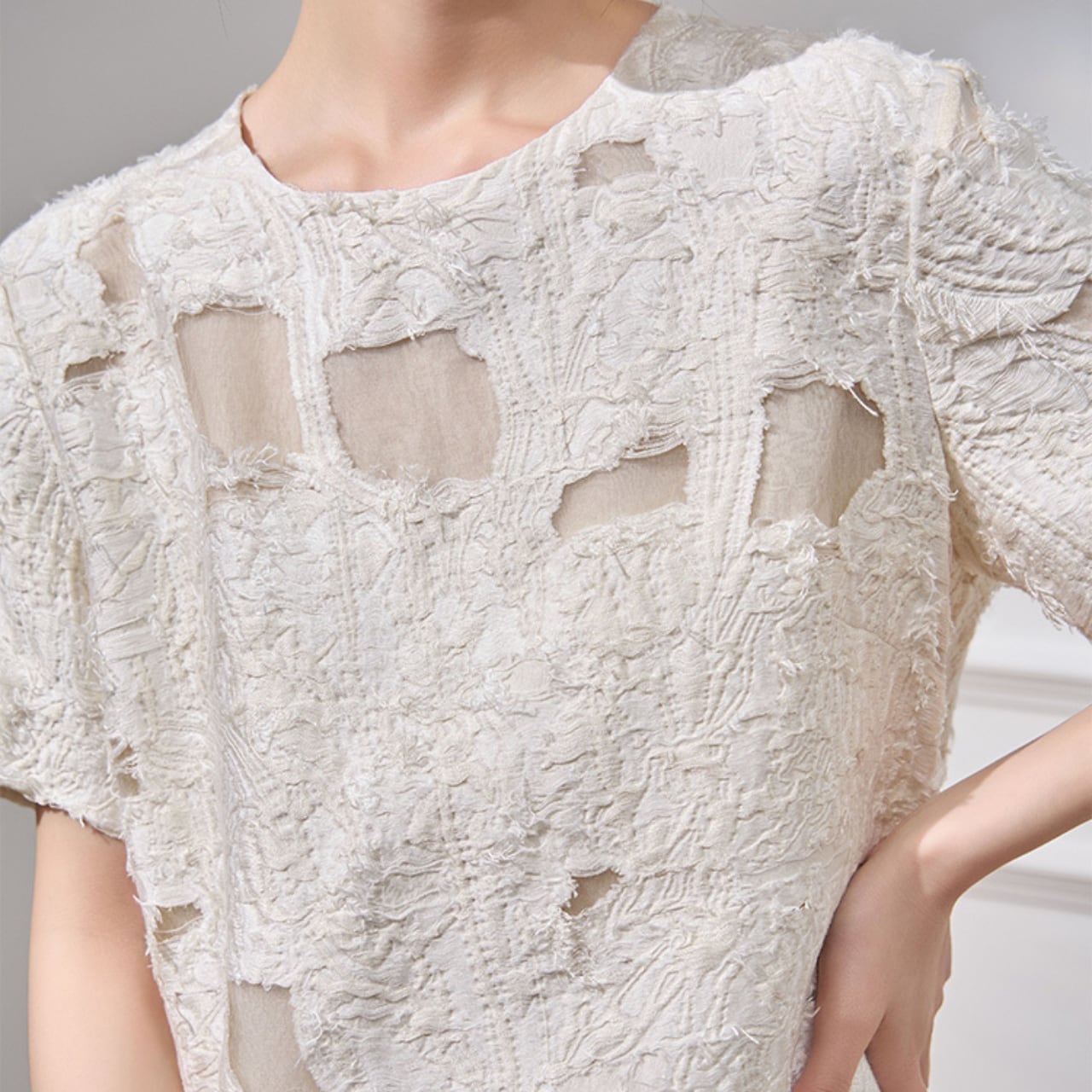 リラックス感がありながらもエレガントなシルエットで、二の腕を程よくカバーしながら軽やかな印象を与えます。