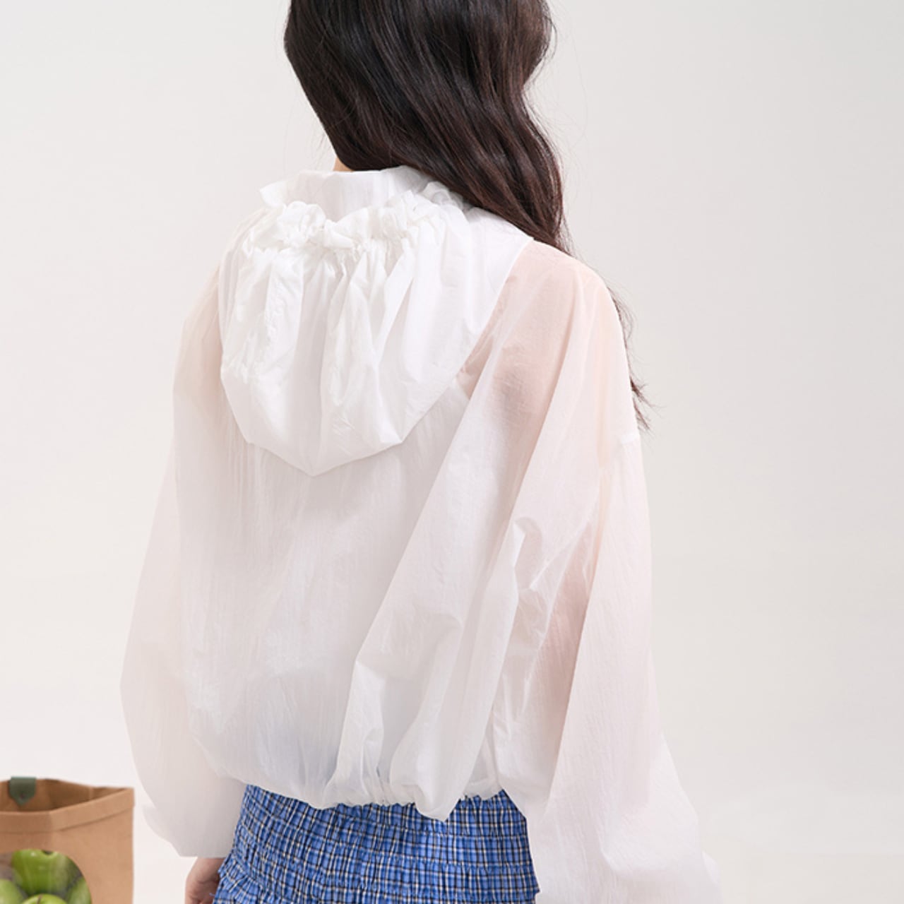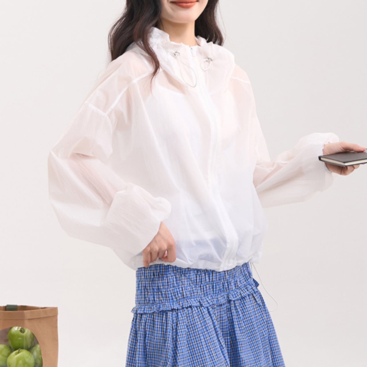 透明感のある軽やかな素材は、夏の陽射しからお肌を守りつつ、さりげなくオシャレな印象を与えます。ドローストリングのデザインは、シルエットの調整が自由にでき、リラックスした着心地を実現しています。