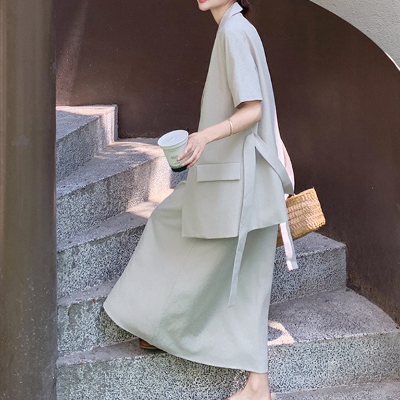 きちんと感とカジュアル感を絶妙にバランスした、ウエストタイジャケットとサスペンダーワンピースのセット。