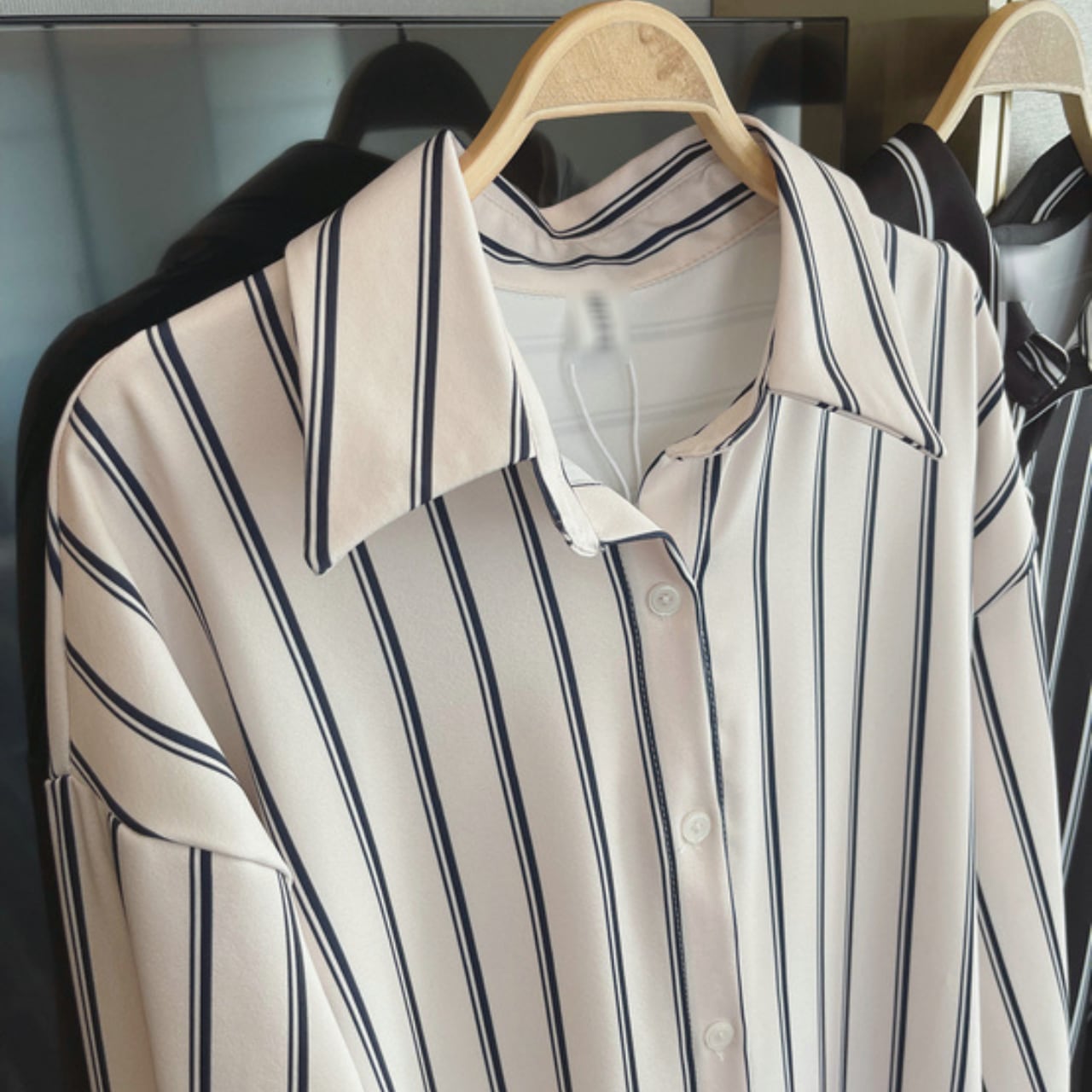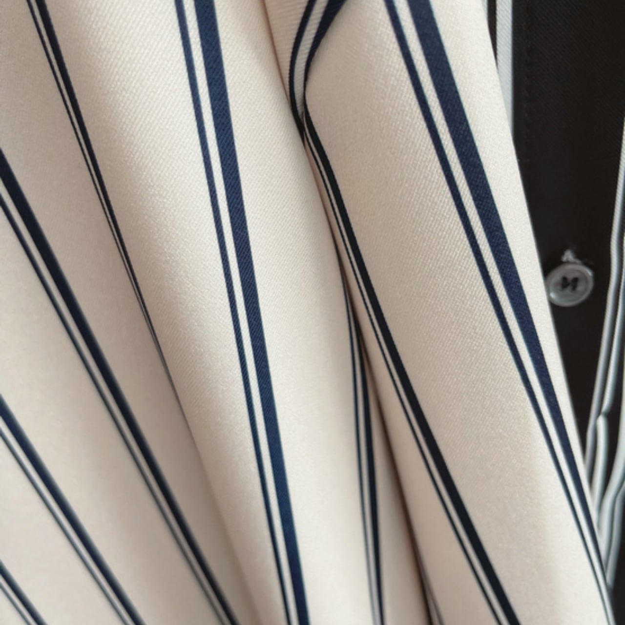 細めのピンストライプが縦のラインを強調し、すっきりとした印象を与えながら、どんな体型にも美しくフィットします。