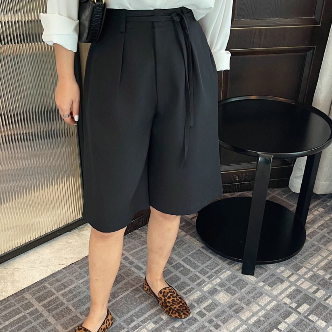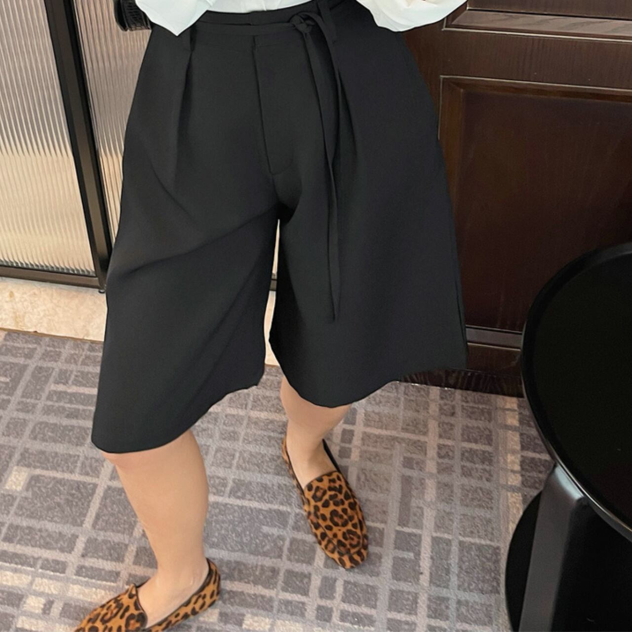 美しいシルエットを演出するブラックワイドレッグパンツ。