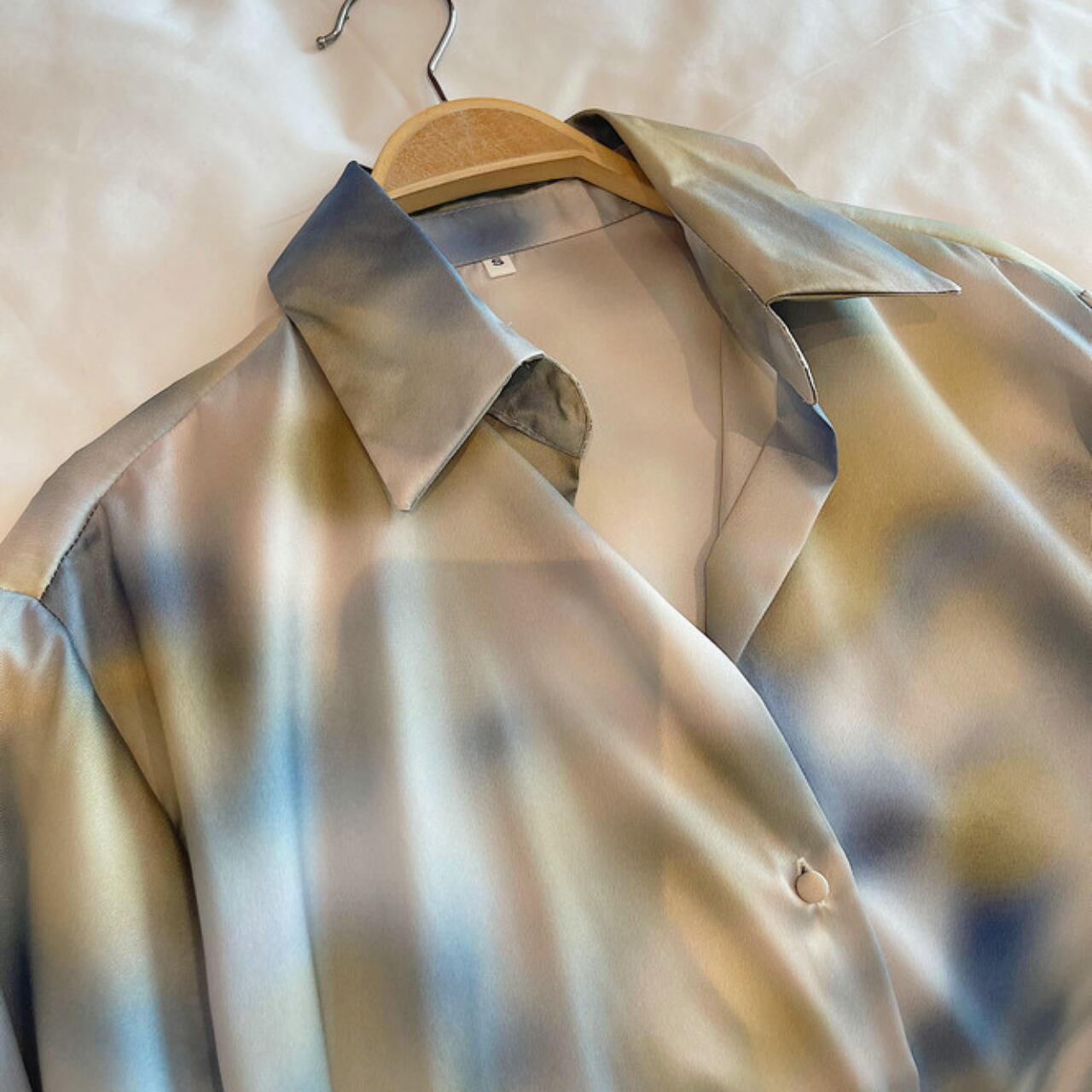 まるで水彩画のような繊細なグラデーションが印象的。ブルー×グレー×ベージュの絶妙な色合いが、着る人を洗練された印象に導きます。一枚一枚微妙に異なる表情を見せる、特別感のあるデザインです。