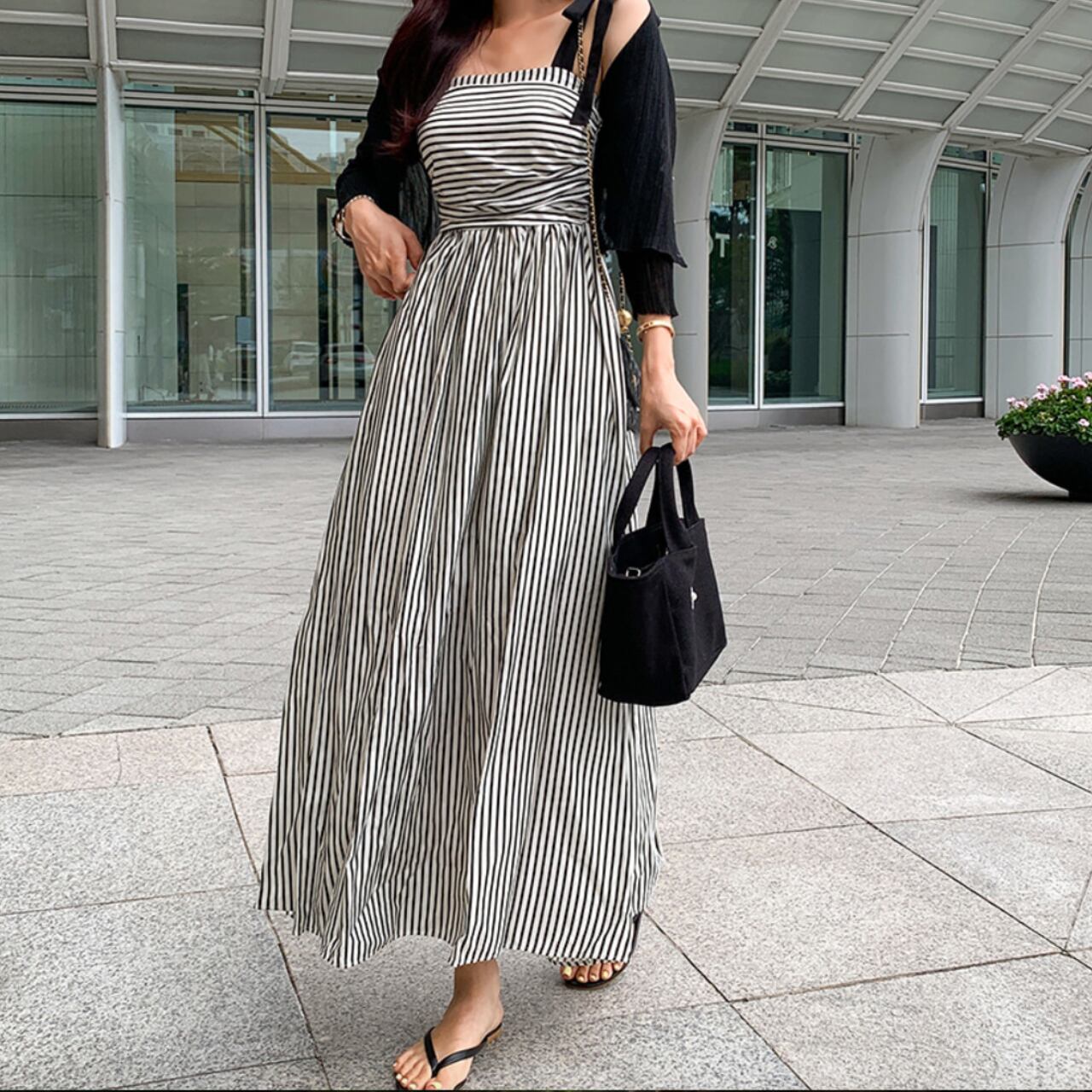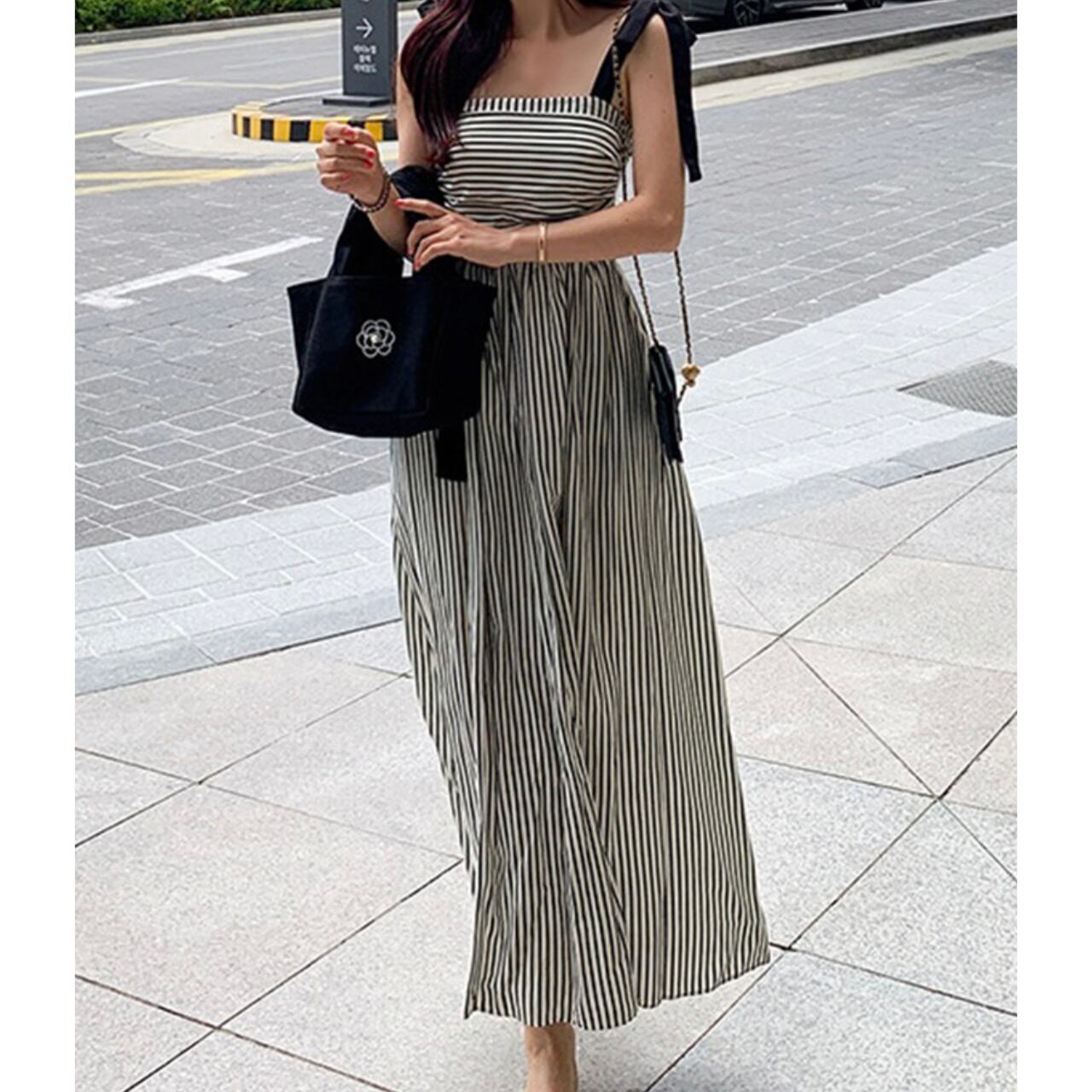 クラシックなモノトーンストライプがオシャレなキャミソールワンピースです。