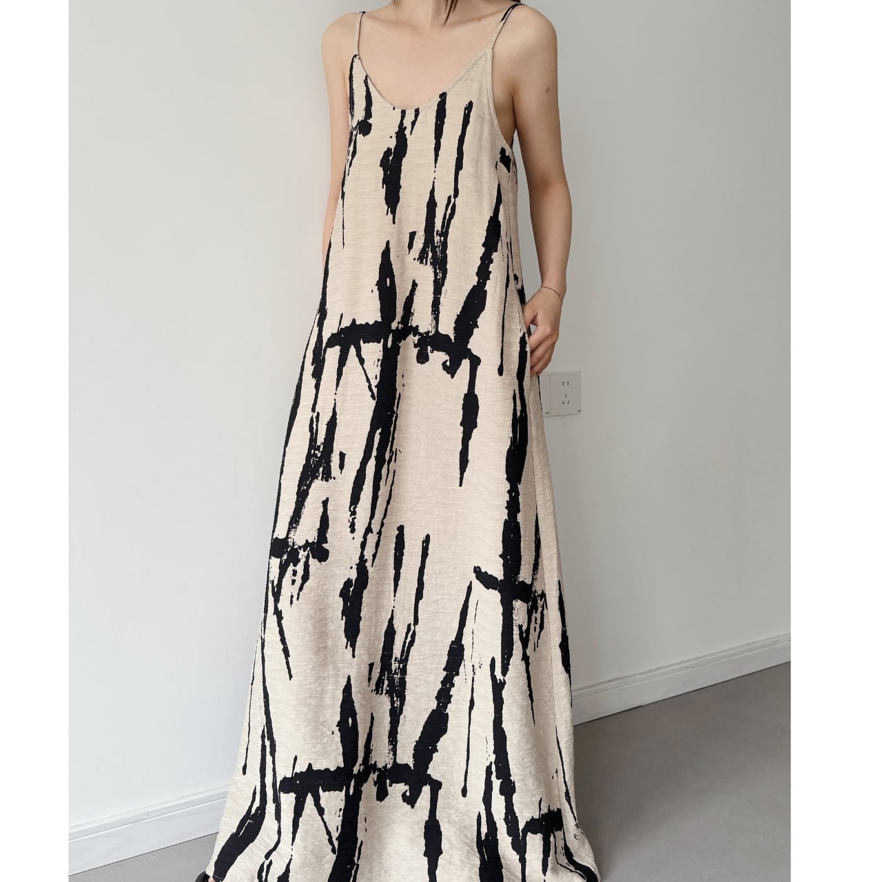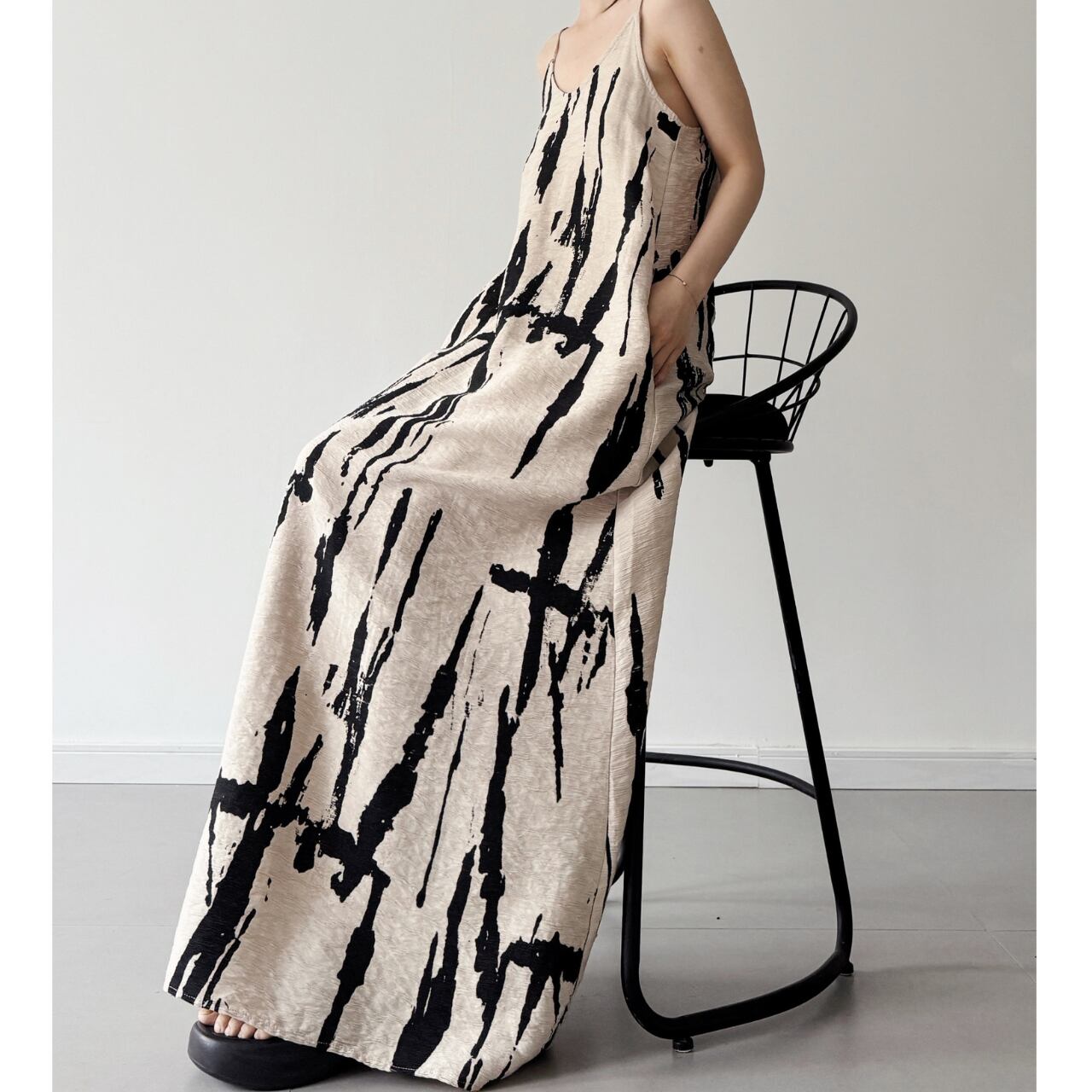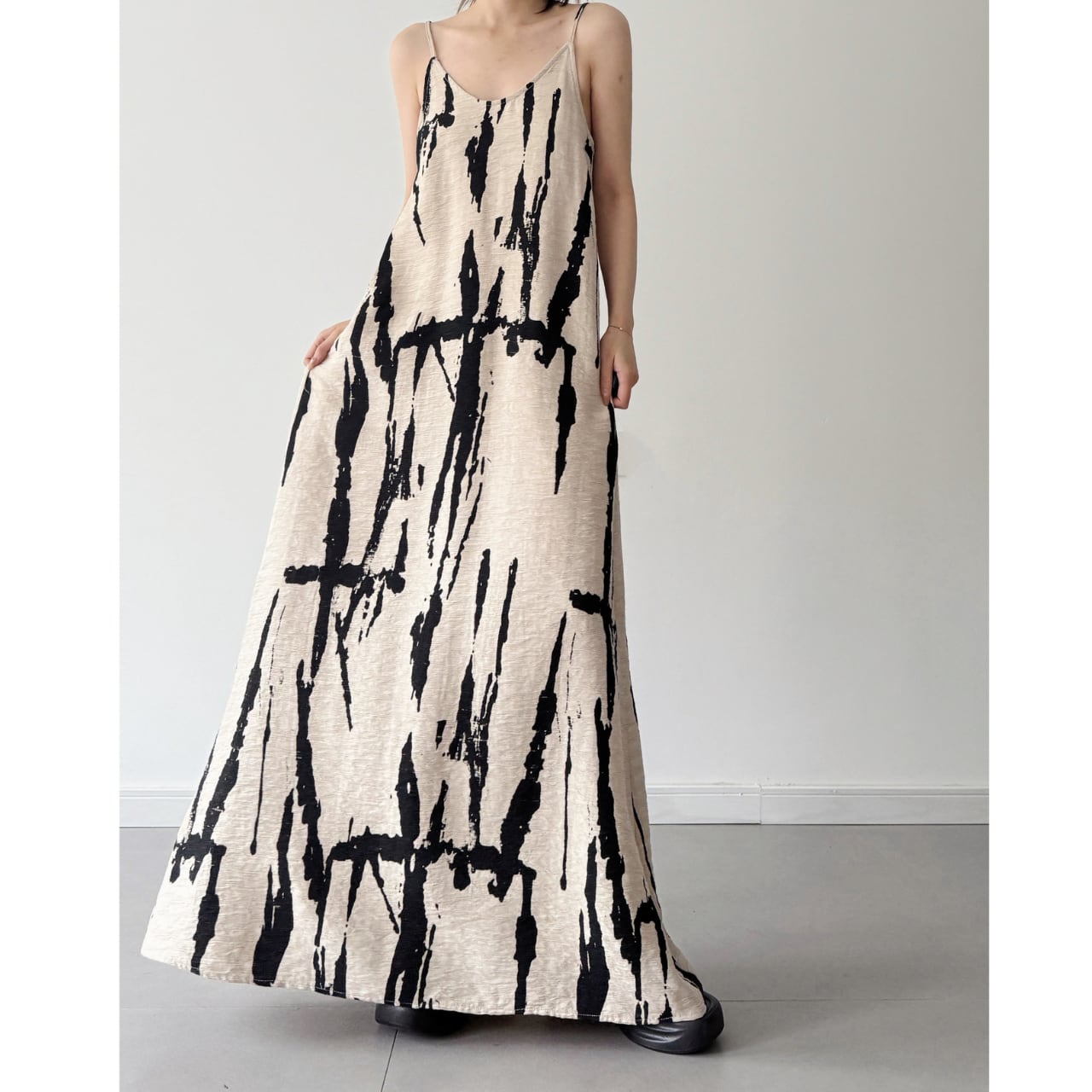 大胆なブラシストロークプリントが印象的な、アーティスティックなキャミソールワンピースです。