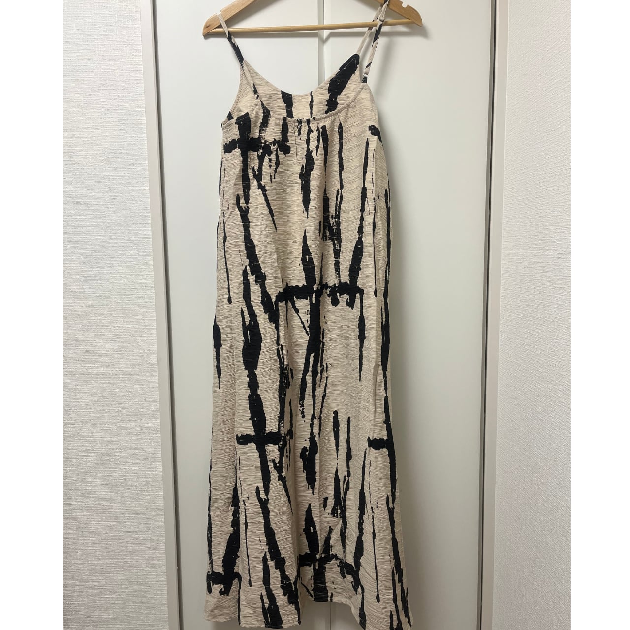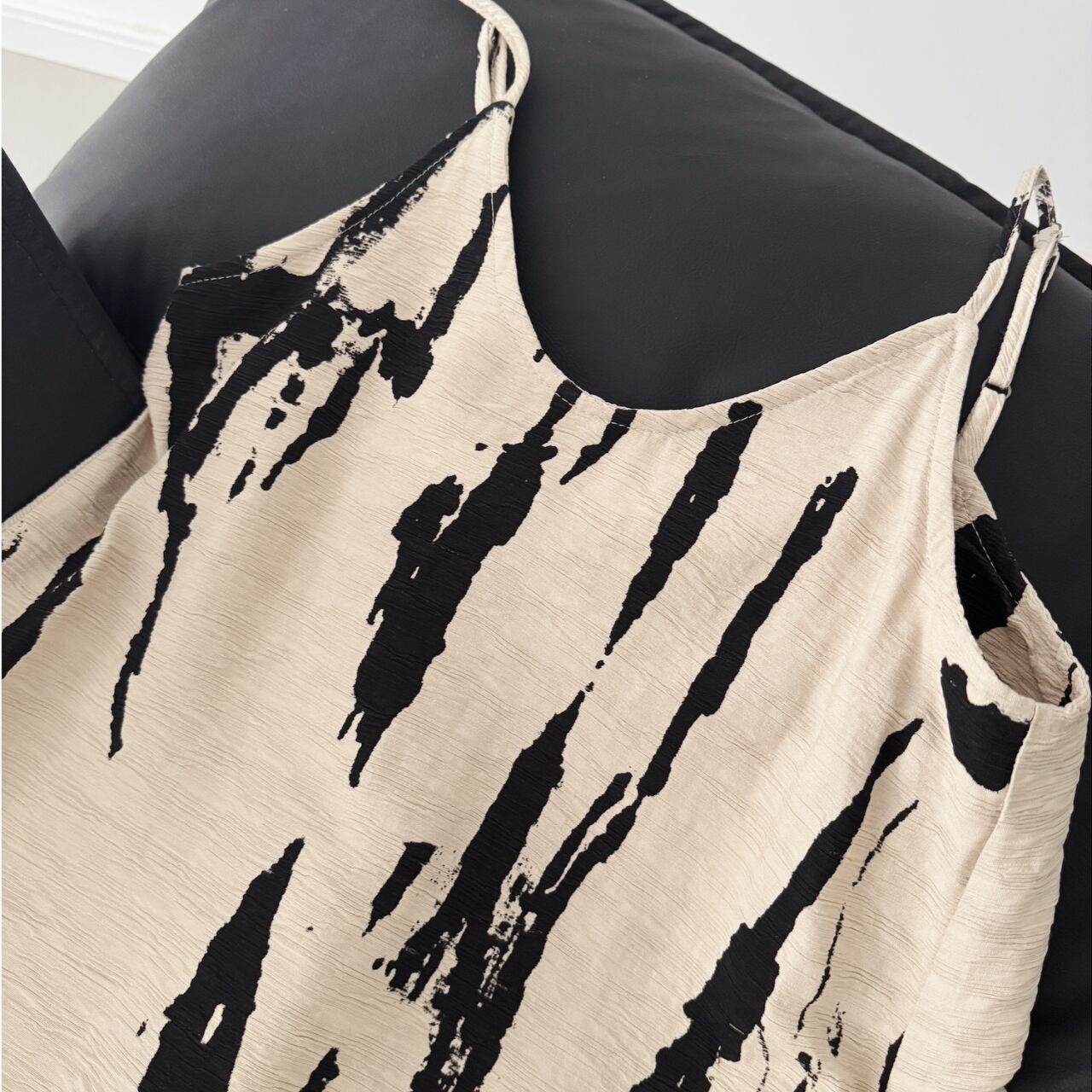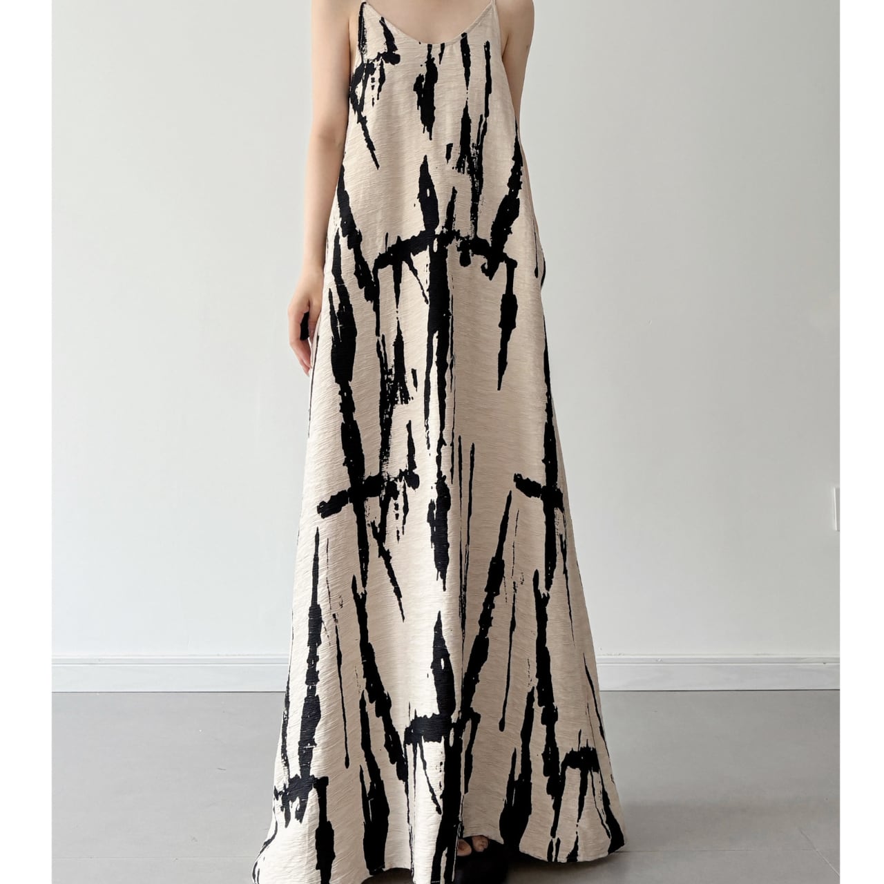 大胆なブラシストロークプリントが印象的な、アーティスティックなキャミソールワンピースです。