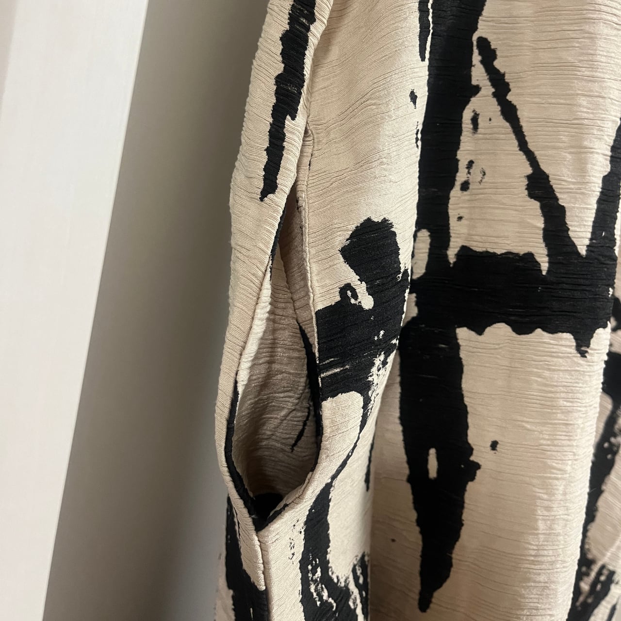 ベージュベースのカラーは上品なニュートラルカラーで大胆なプリントを洗練された印象に。