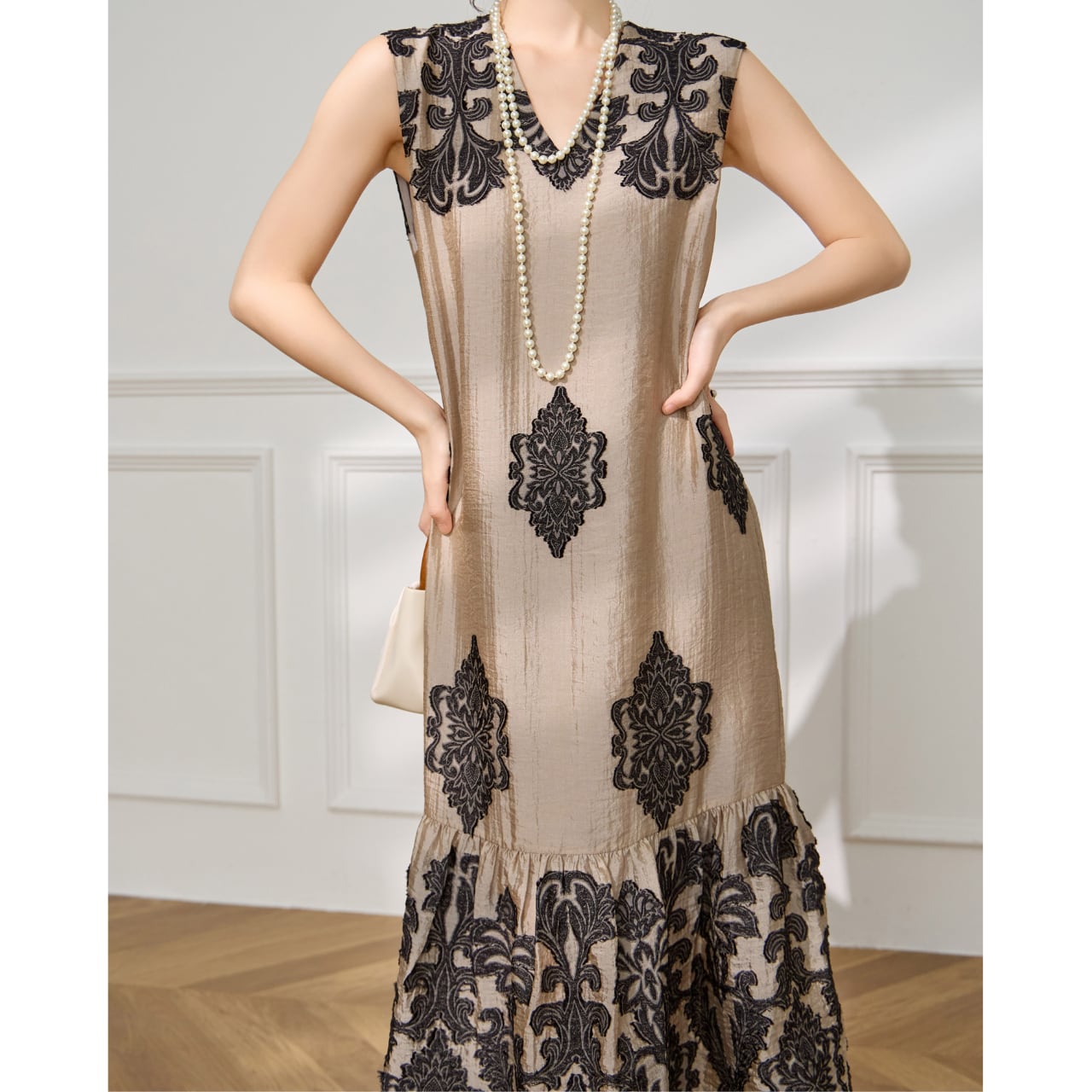 繊細な刺繍が施された、上品で洗練されたノースリーブワンピースです。