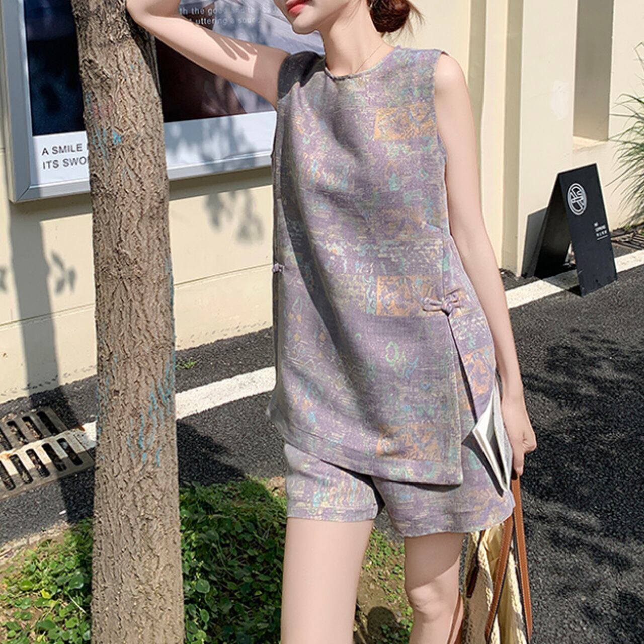 淡いパープルベースに繊細な柄プリントを施したセットアップ。