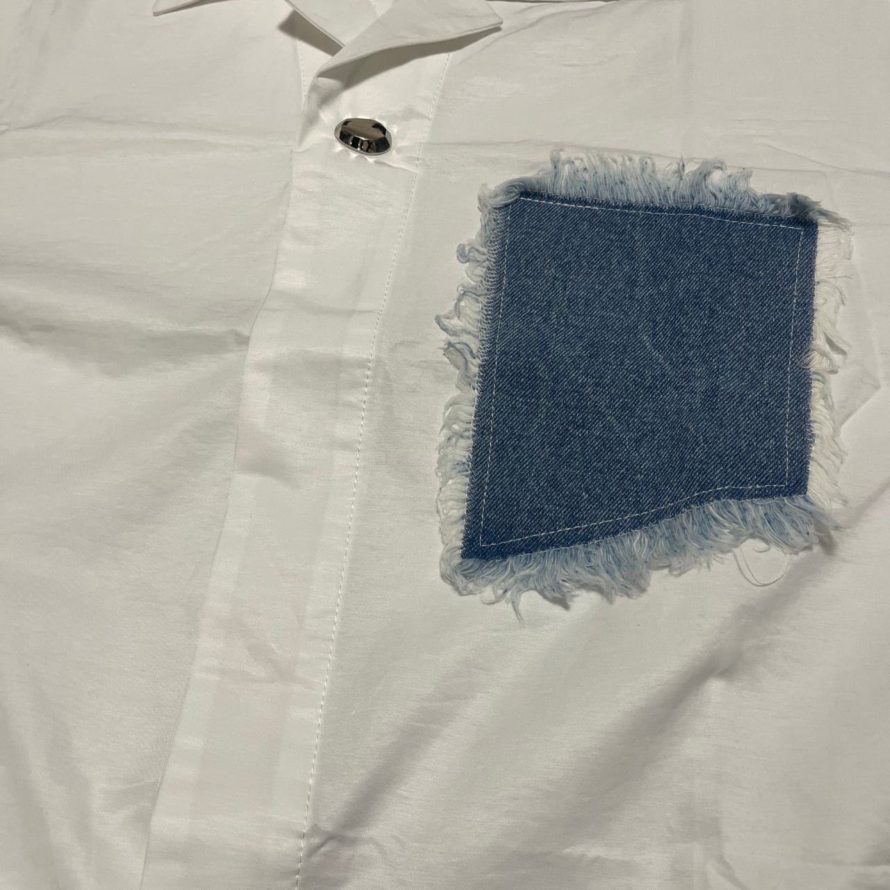 胸元のデニムパッチがアクセントとなる個性的なデザインのホワイトシャツ。
