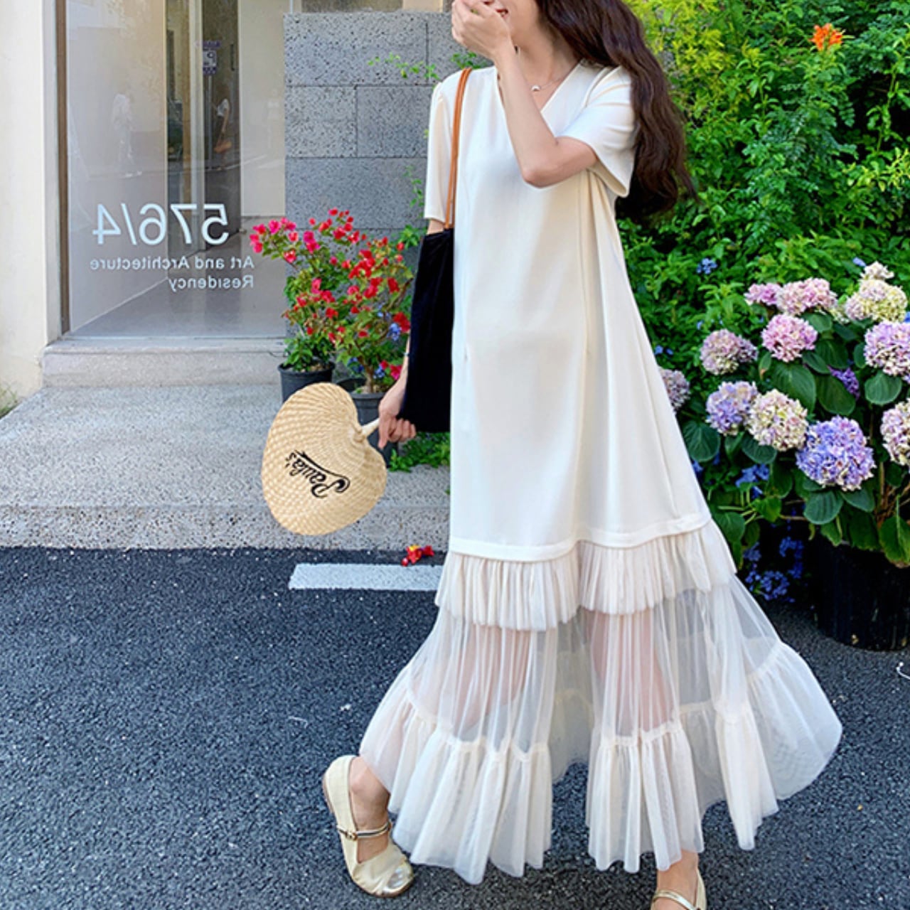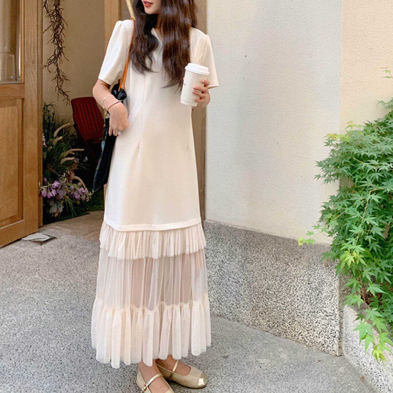 上品なメッシュ素材を重ねた洗練されたレイヤードスタイルが立体的な質感で華やかさをプラス。歩くたびに優雅に揺れるシルエットが、甘すぎないフェミニンカジュアルを実現します。