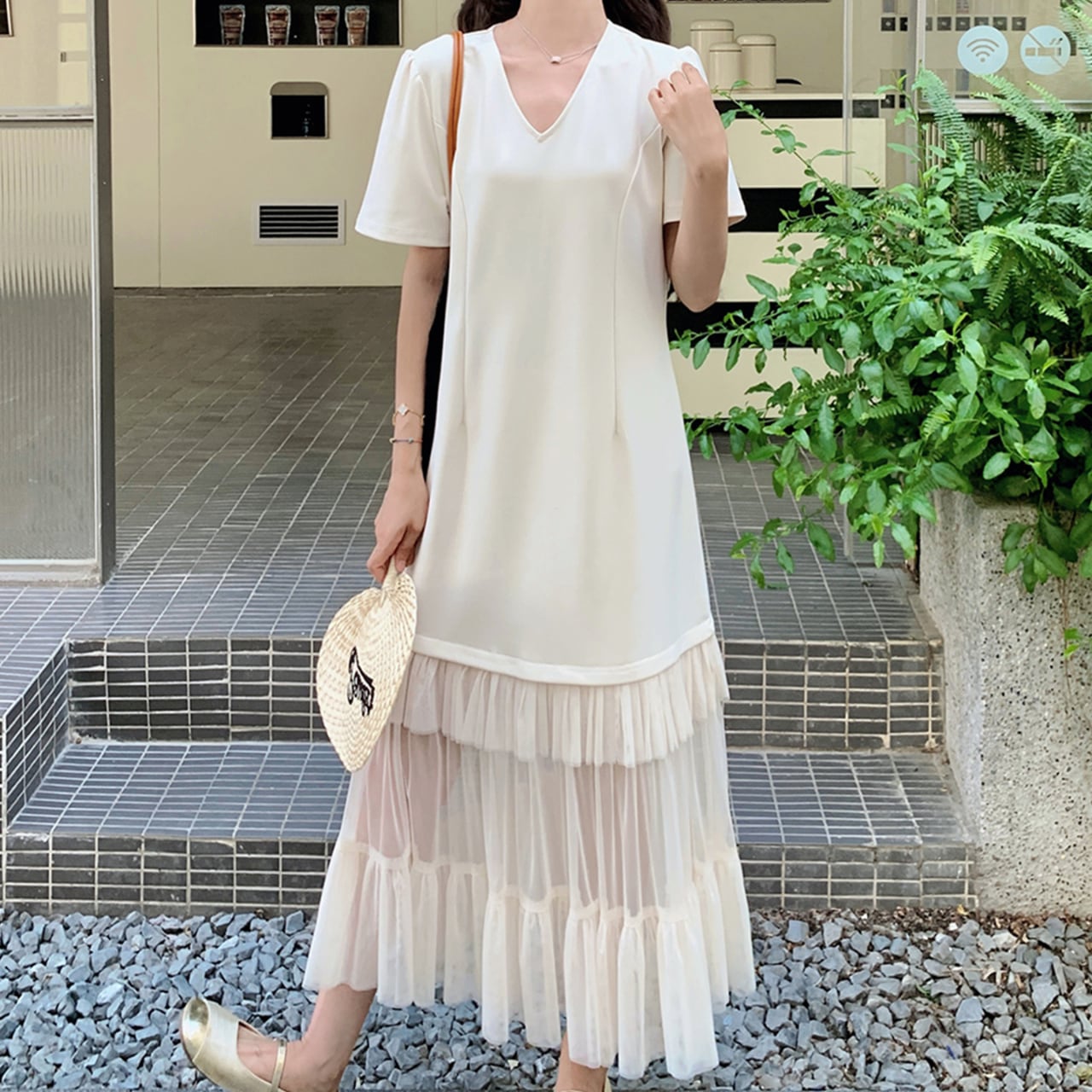 涼しげな透け感が魅力的な透け感レイヤードロングワンピース。
