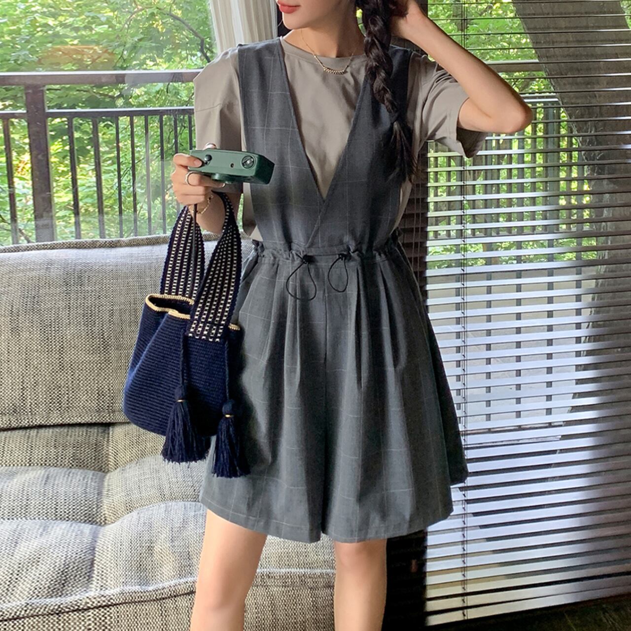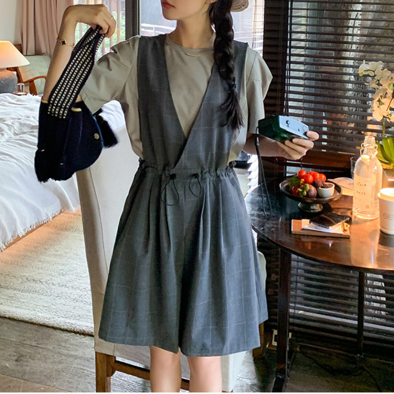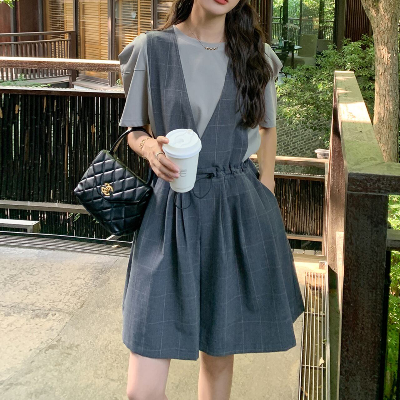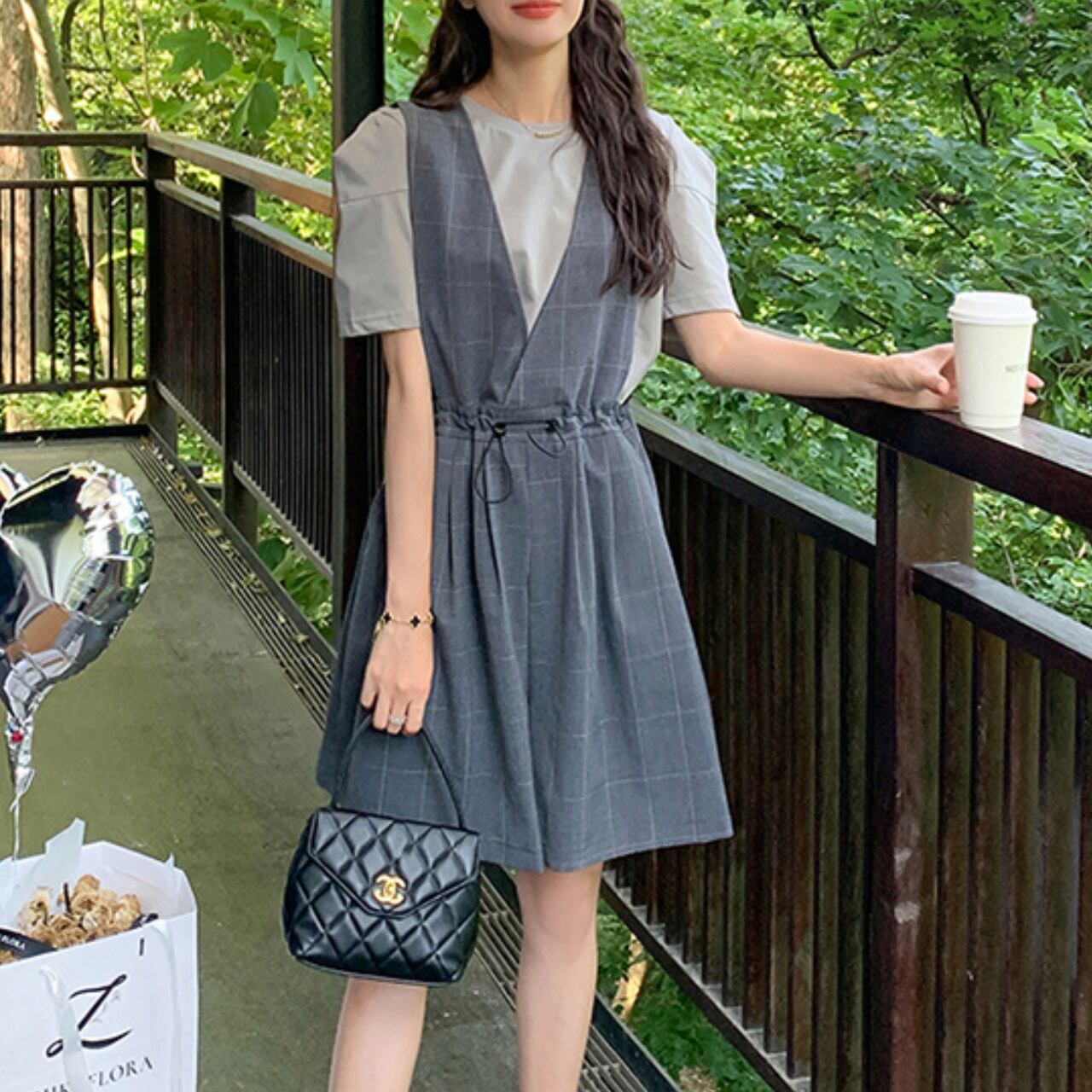 Tシャツ&グレーのチェック柄ワンピースセット。