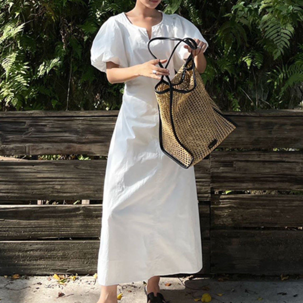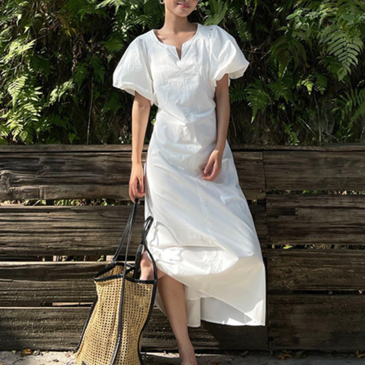 トレンド感溢れるパフスリーブが印象的なホワイトワンピース。