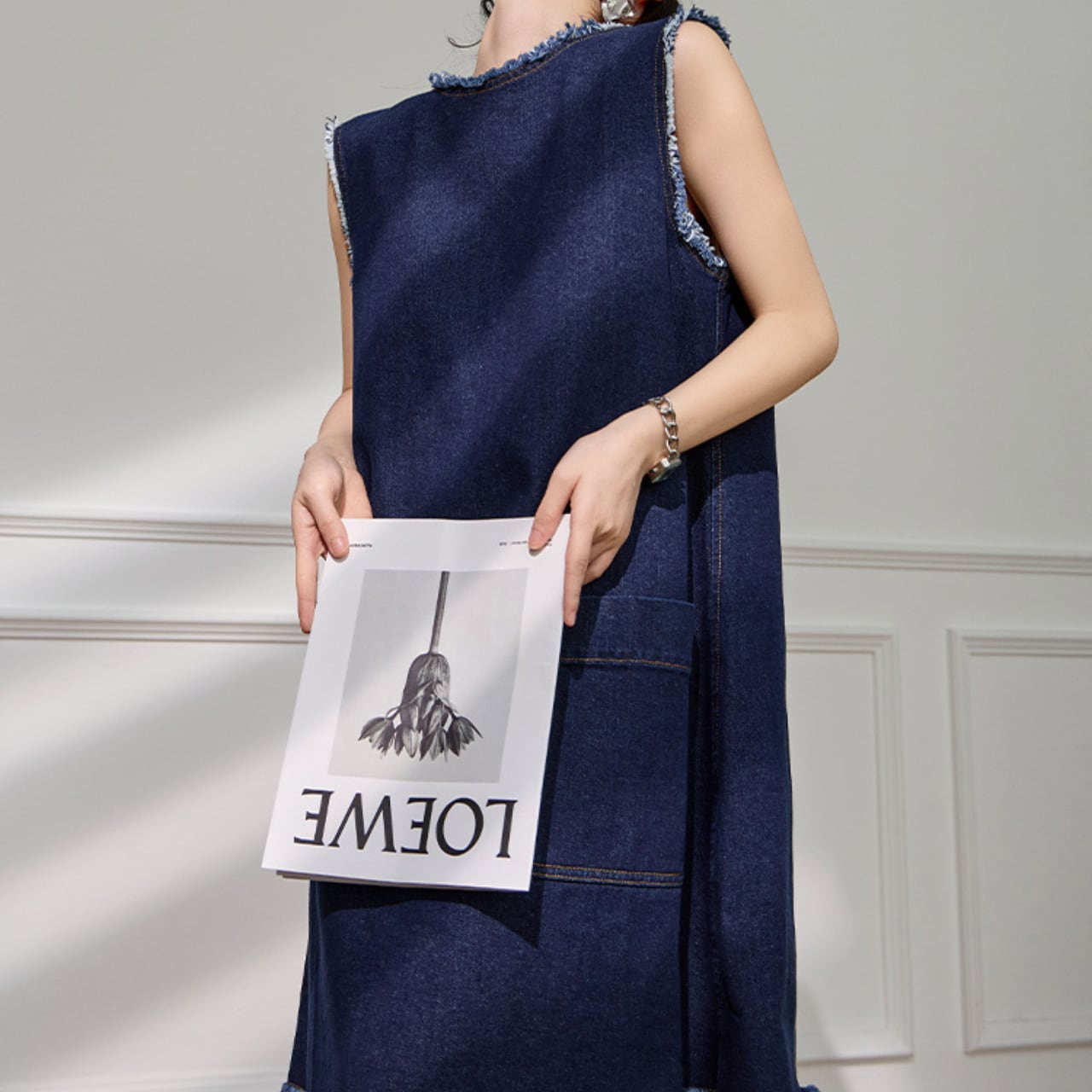 デニムの持つカジュアルな魅力と、洗練されたデザインが融合した特別なワンピース。フリンジディテールが織りなす独特の表情と、計算されたシルエットが、日常を特別なものに変えてくれます。