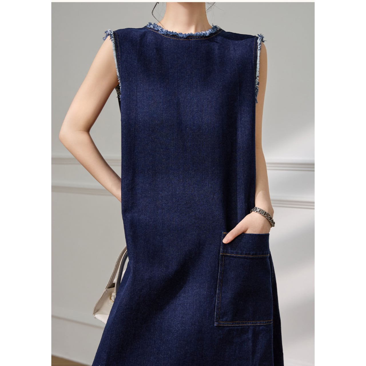 ノースリーブのすっきりとした肩周りで腕のラインを美しく見せ、ミディ丈シルエットが上品な大人の女性にふさわしい品格を保持します。