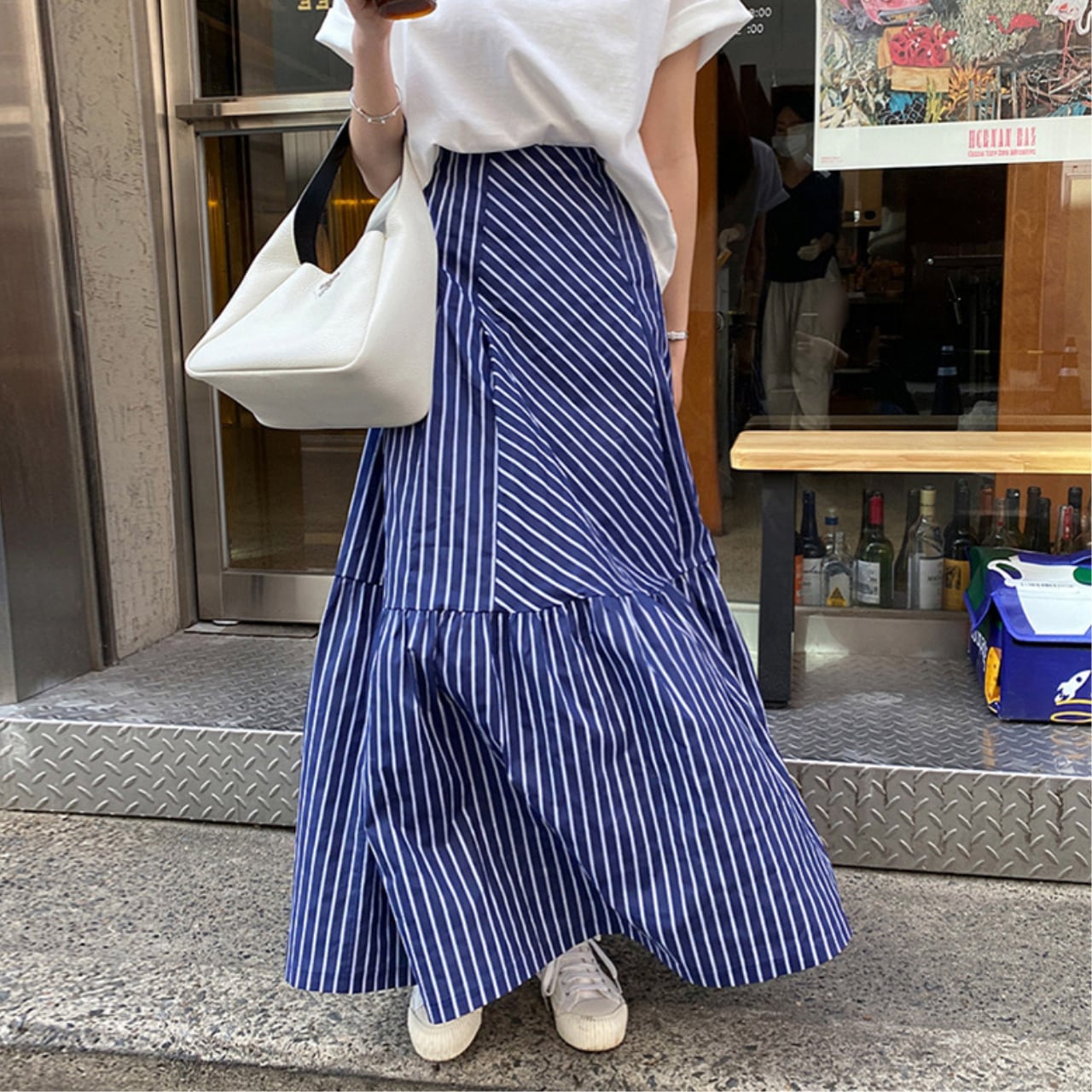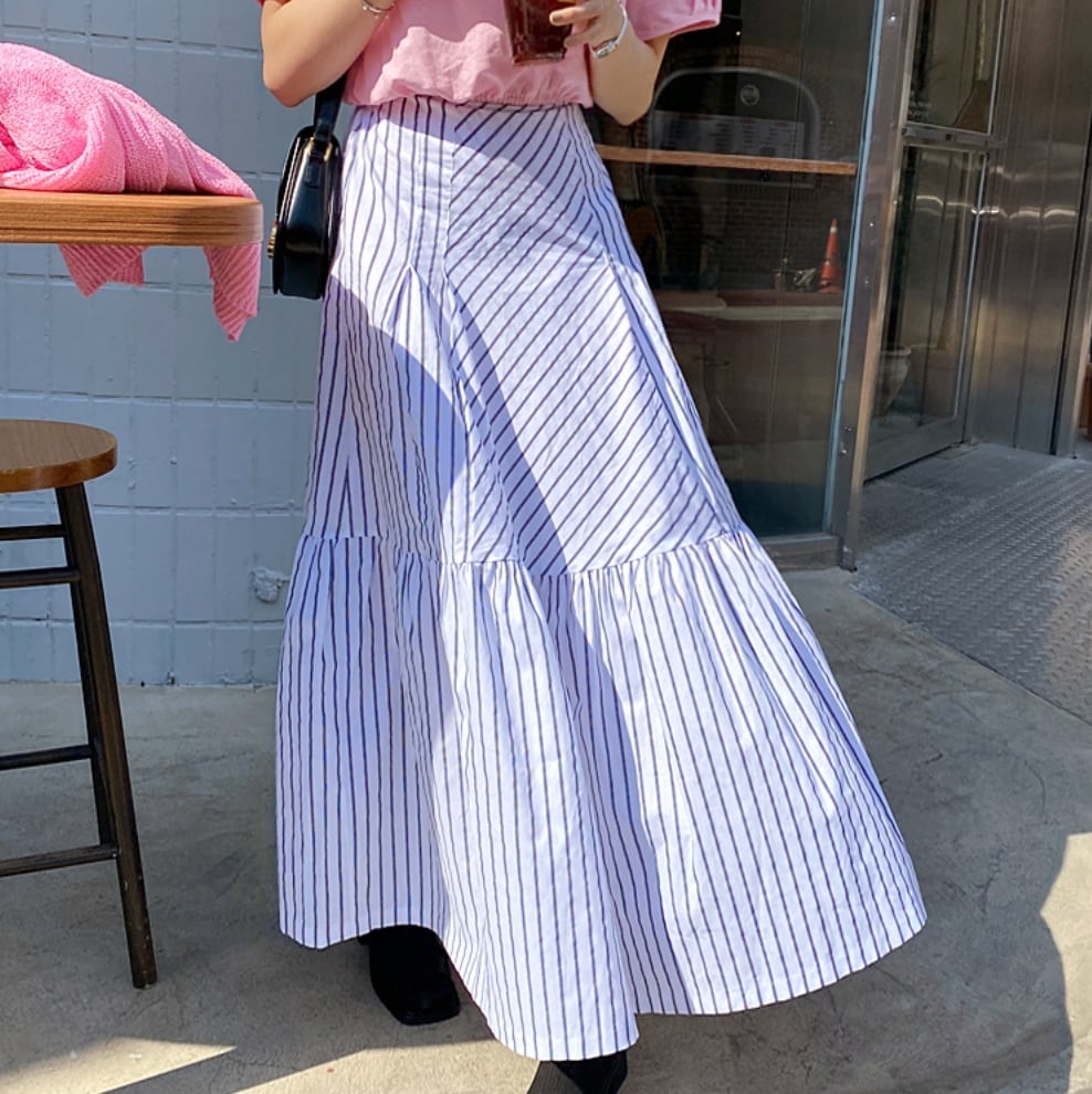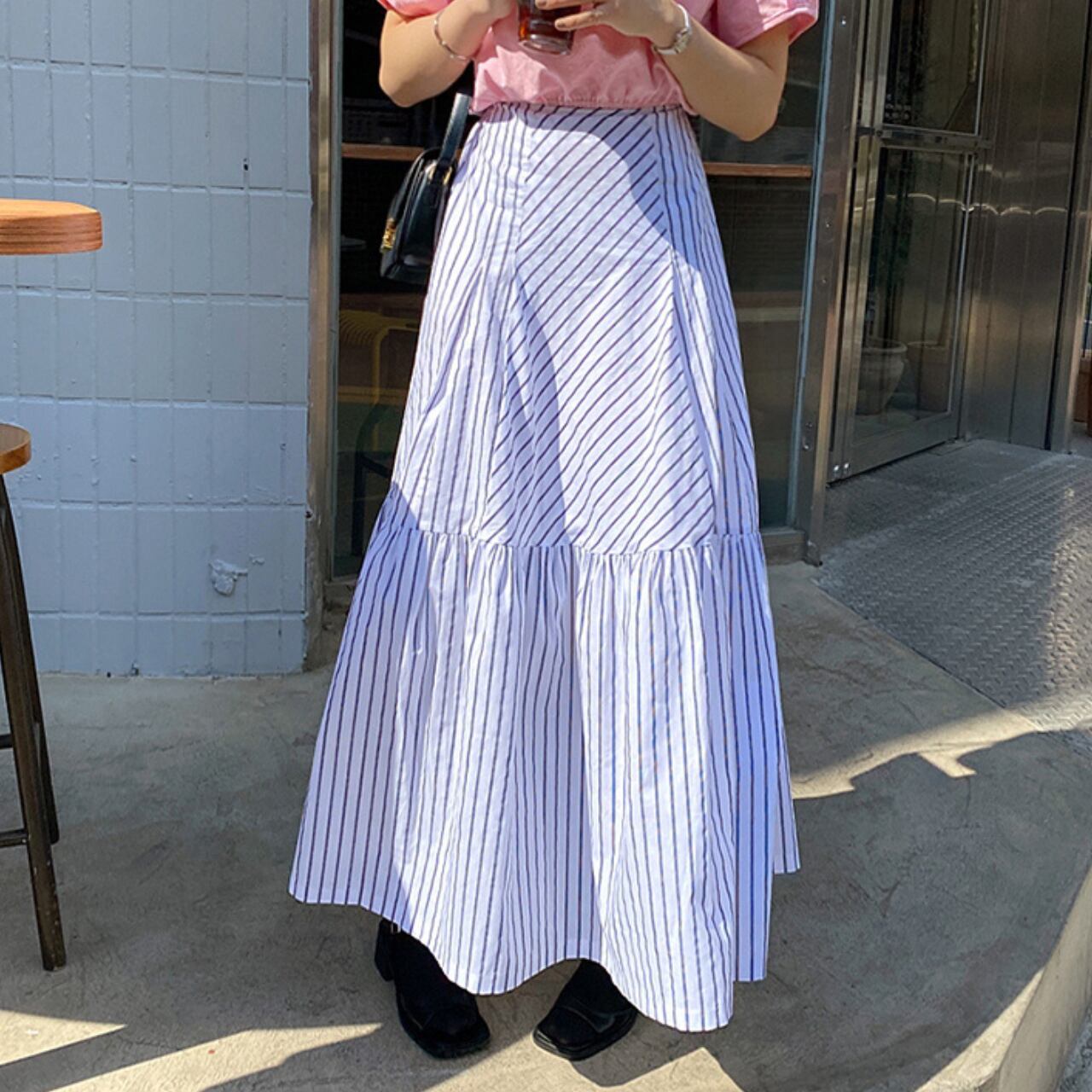 タイムレスなストライプ柄とティアードデザインが融合した、エレガントなロングスカート。